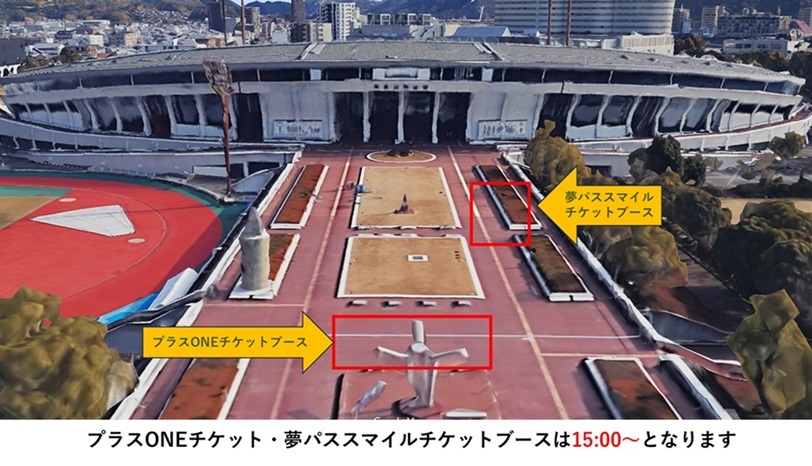 試合当日に、サンサンデッキ上(入場ゲート前)「プラスONEチケットブース」へお越しいただき、お手元のチケットのご呈示をお願いいたします。