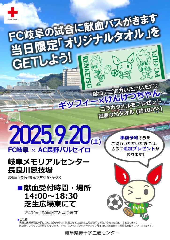 | 概要 | FC岐阜のホームゲーム会場にて献血を実施いたします。皆さまのご協力をよろしくお願いいたします。 |