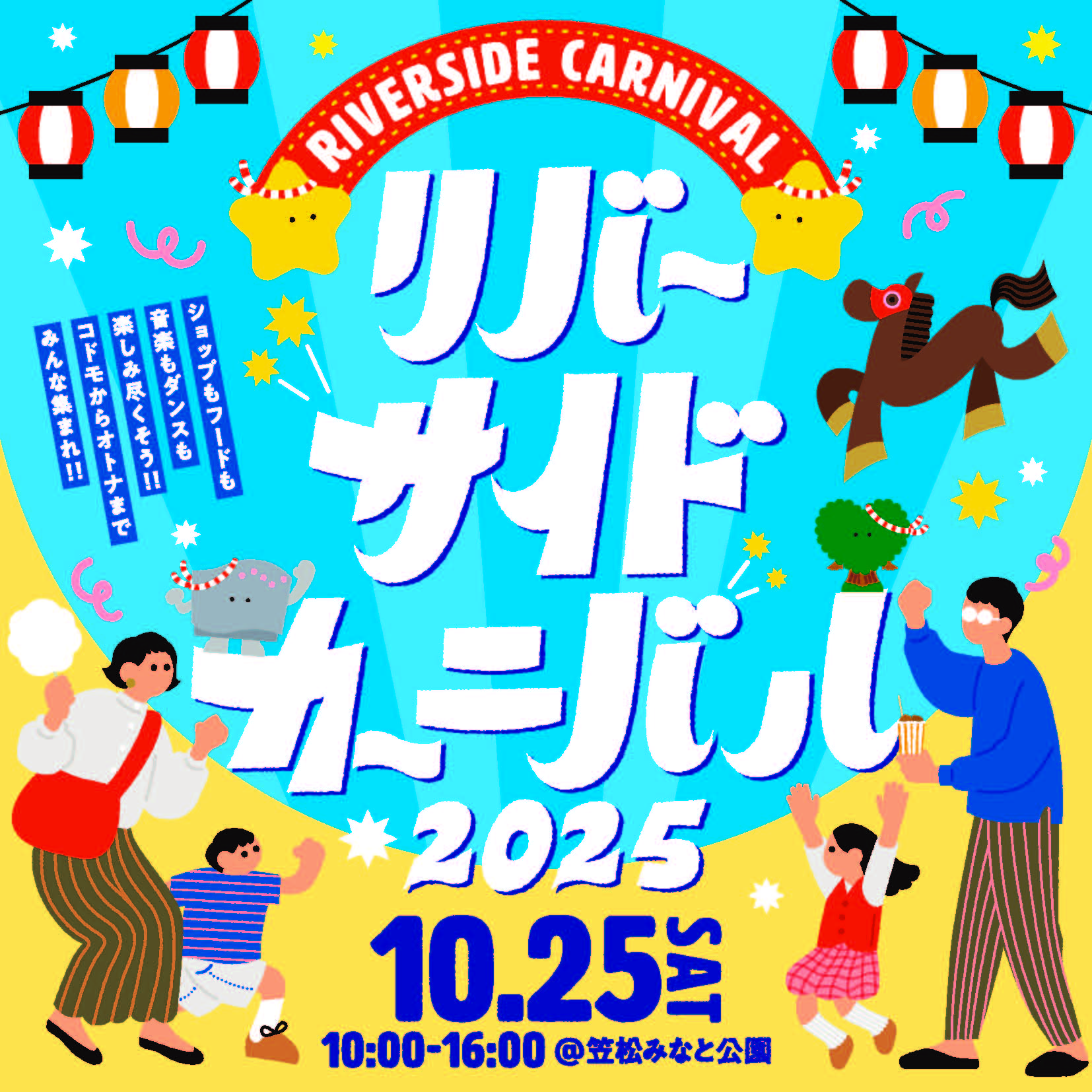 | 概要 | 川辺の公園がにぎやかなイベント空間に!笠松の魅力をぎゅっと詰め込んだリバーサイドカーニバルを開催します。美味しいグルメが満喫できるキッチンカーや、ステージパフォーマンス、乗馬体験など一日中楽しめます♪ |