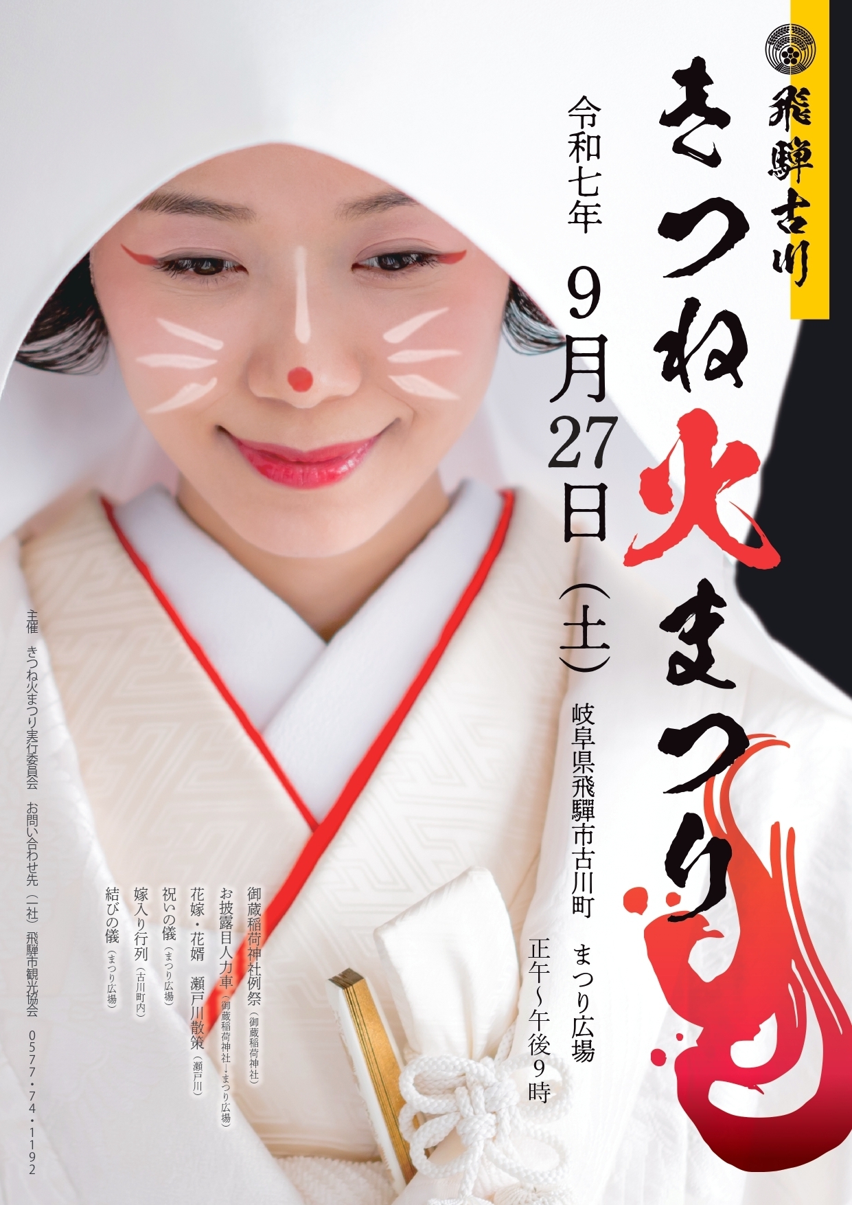 | 概要 | 飛騨古川で開催される「きつね火まつり」は、秋の夜に町全体が幻想的な灯りで彩られる、特別なお祭りです。 毎年全国から公募で花嫁花婿が選ばれます。選ばれたカップルが、きつねに扮して古川の街を練り歩く様子は、まるで童話の一場面のようです。観光客も「きつねメイク」を施し、気軽にきつねになっておまつりに参加できます。 |