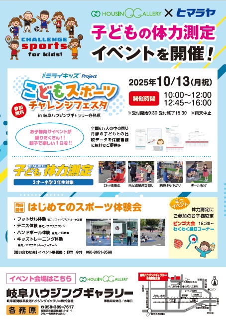 | 概要 | 当日は子ども向けのスポーツイベントが盛りだくさん!! 「子ども体力測定」では4種目の測定をしよう!! 「はじめてのスポーツ体験会」でフットサルやテニス、 ハンドボール、キッズトレーニングの体験もできます。 元気に体を動かし、スポーツを楽しもう!! |