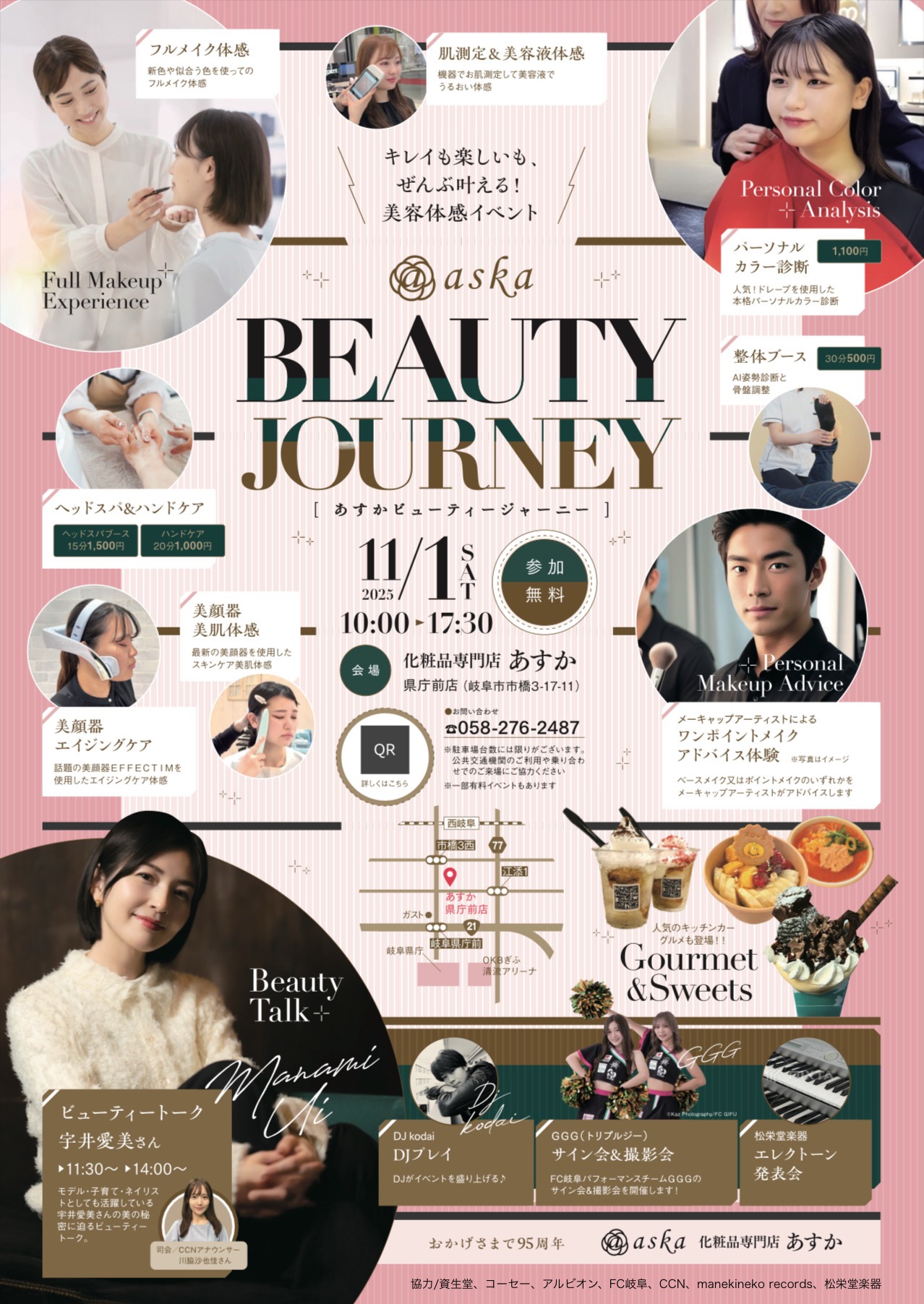| 概要 | キレイも楽しいもぜんぶ叶える美容体感イベント「あすかビューティージャーニー」 メーキャップアーティストのワンポイントアドバイスやフルメイク体感、美顔器体感など美容ブースが盛りだくさん。 モデルの宇井愛美さんのトークショー、GGGのサイン&ツーショット撮影会、キッチンカーなど楽しい催物もあり、1日楽しめるイベントです。 |