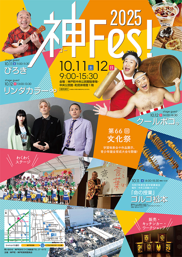 | 概要 | 神Fes!は文化祭と同時開催の音楽や大道芸、マルシェ、キッチンカー、ワークショップ満載の神イベント!地元クラブのパフォーマンスや強烈な個性を持つゲストのステージは観覧無料なのでぜひお越しください!! |