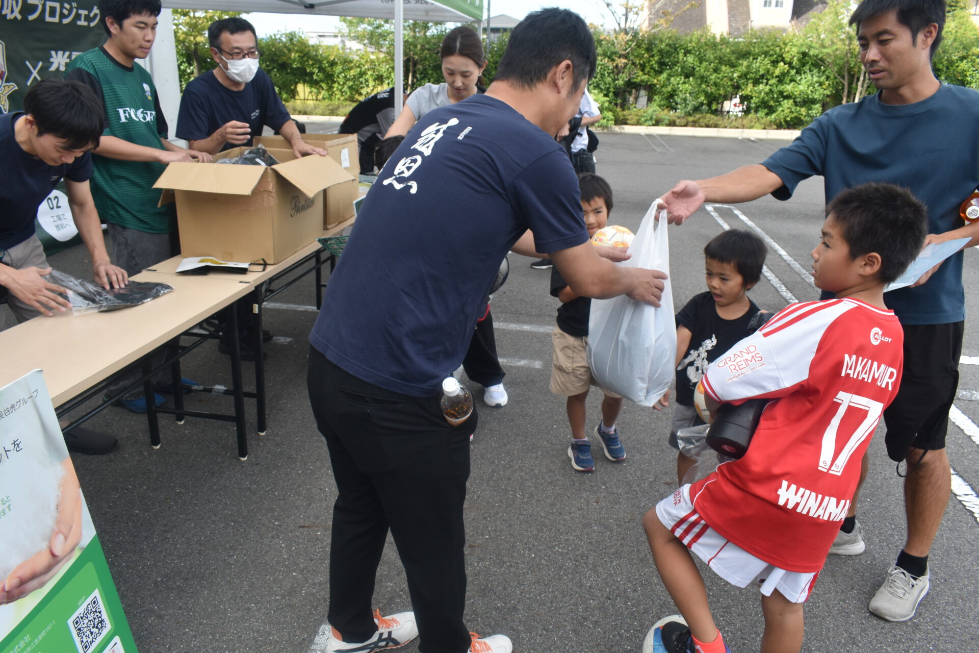 また、参加者の皆さんには長谷虎紡績株式会社様よりオリジナルTシャツが配布されました!このオリジナルTシャツは、昨年開催したサッカー教室で回収した古着をリサイクルして作られたものです。