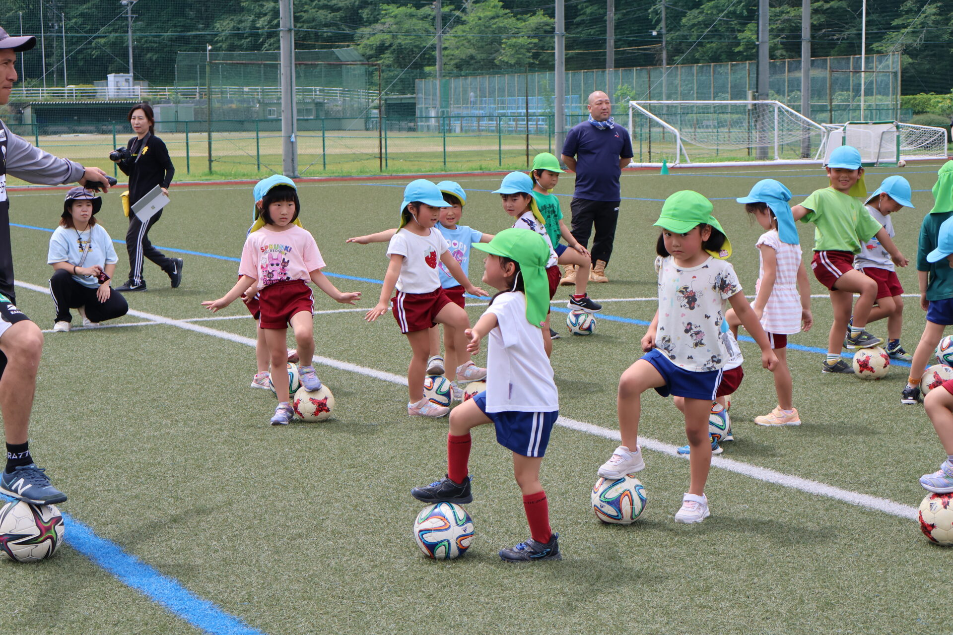 サッカーボールに触れることに留まらず、キック・ドリブル・コントロールといったサッカーの基本技術を、デモンストレーションを交え楽しく伝えます。