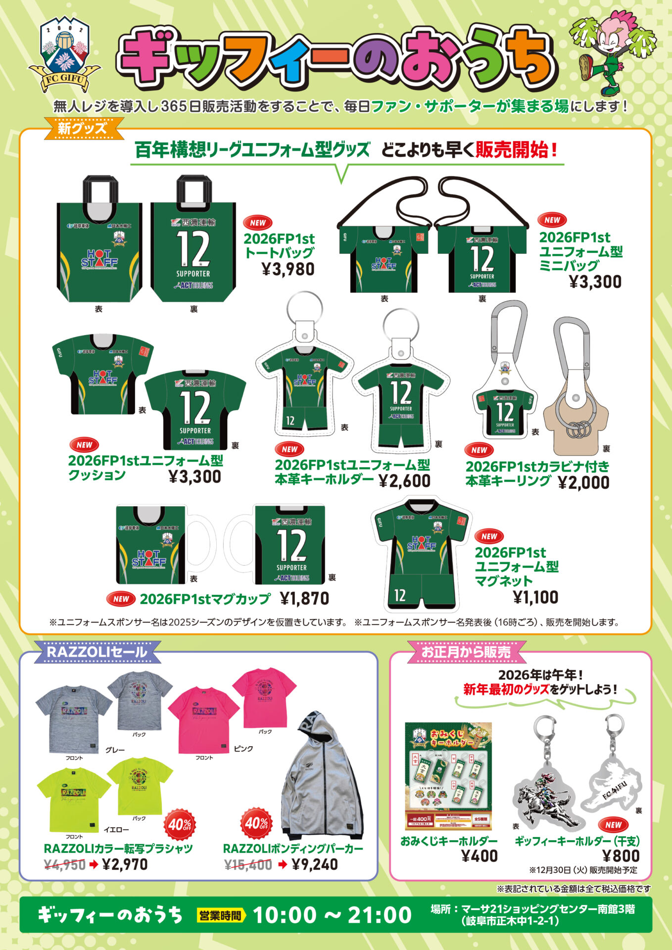 2025.12.26 (Fri) お知らせグッズ 1/10(土)FC岐阜サテライトプラザ 「ギッフィーのおうち」新商品販売のお知らせ 場所 マーサ21ショッピングセンター(岐阜市正木中1-2-1)南館3階 内容 新商品販売