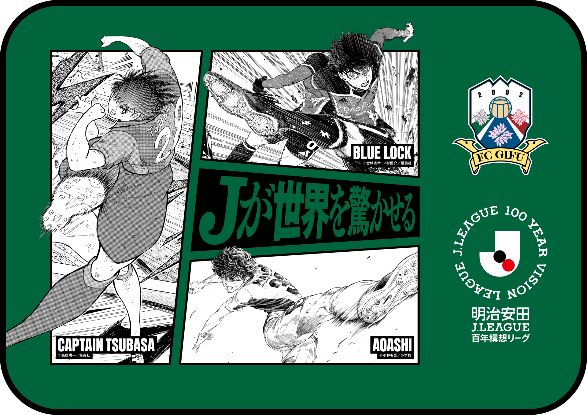 本企画は、シーズン移行に際して開催される特別な大会である「明治安田Jリーグ百年構想リーグ」を記念して実施されるものです。ブランケットのデザインには、日本が世界に誇るサッカー漫画「キャプテン翼」をはじめ、近年国内外で絶大な人気を誇る「ブルーロック」「アオアシ」の3つの作品との史上初のトリプルコラボレーションが実現しました。シーズン移行という大きな転換点を経て、Jリーグが今後さらに結果を出し、世界を驚かせるという意思を、3作品の主人公が放つ力強いシュートと重ね合わせ、メッセージとして発信していきます。
