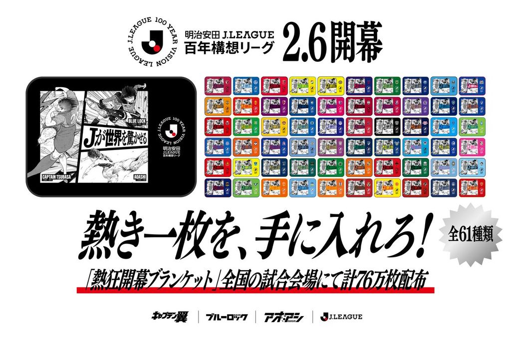 Jリーグは、2026年2月6日(金)に開幕する明治安田Jリーグ百年構想リーグの開幕を記念し、2026年2月から3月にかけて行われる開幕期の対象試合において、クラブごとにデザインされた特製ブランケット(全61種)を合計76万枚、来場者の皆さまにプレゼントいたします。