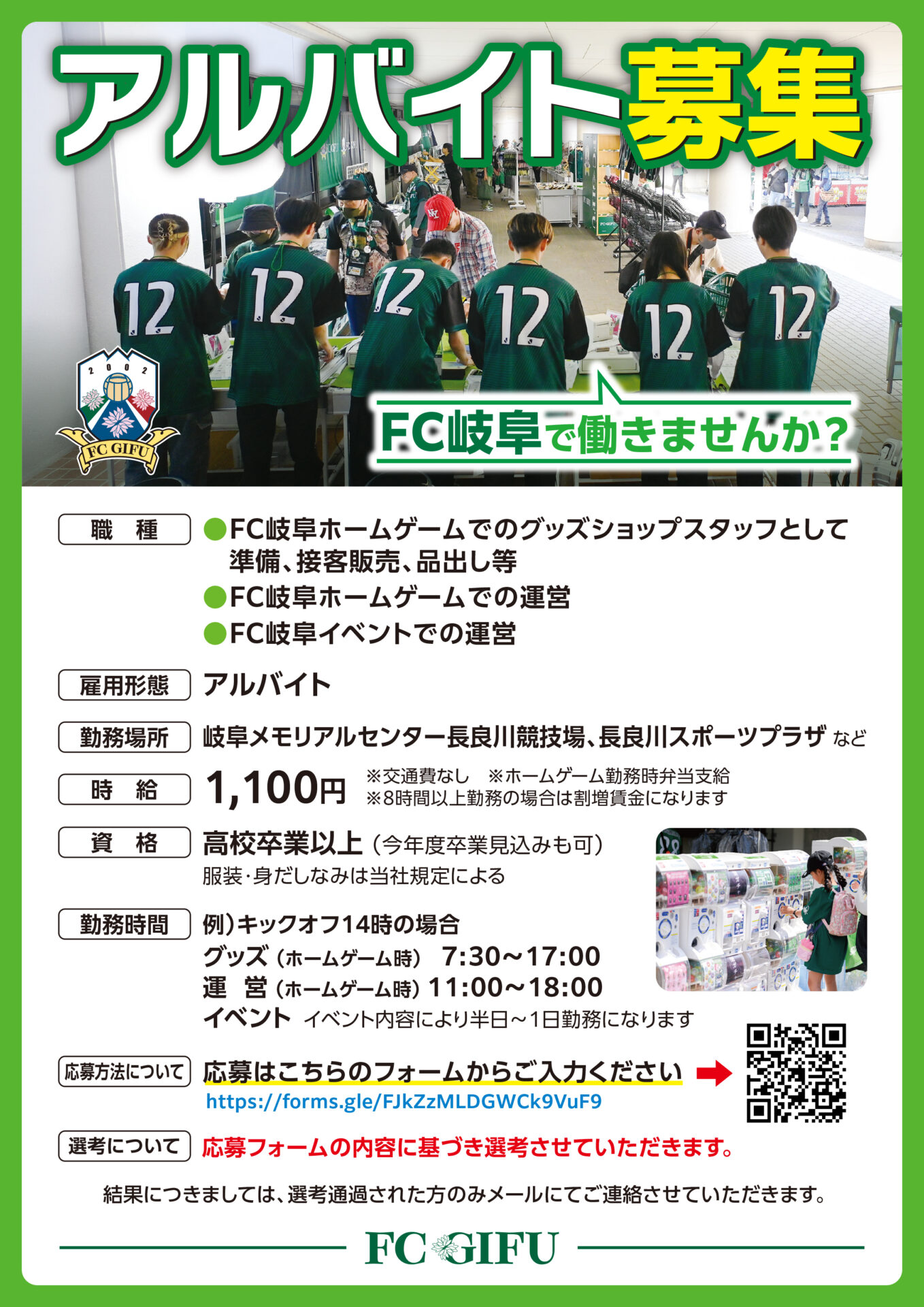 2026.01.13 (Tue) お知らせ アルバイト募集のお知らせ FC岐阜では、グッズ販売、イベント、ホームゲーム運営のアルバイトを募集しています。 興味のある方は、ぜひご応募ください。応募フォームはこちら
