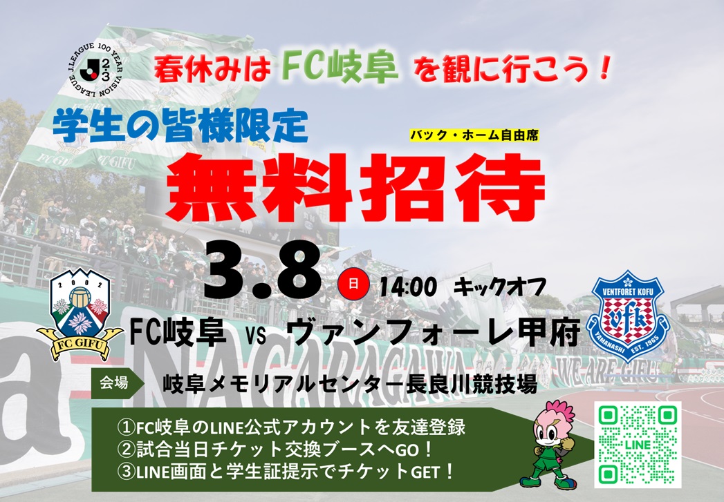 【学生限定招待キャンペーン】春休みはFC岐阜を観に行こう!【3月8日(日)ヴァンフォーレ甲府戦】