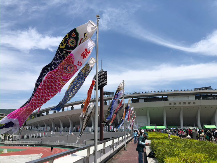 サンサンデッキ上に「こいのぼり」が泳ぎます。優雅に泳ぐ「こいのぼり」と一緒に写真を撮ろう!