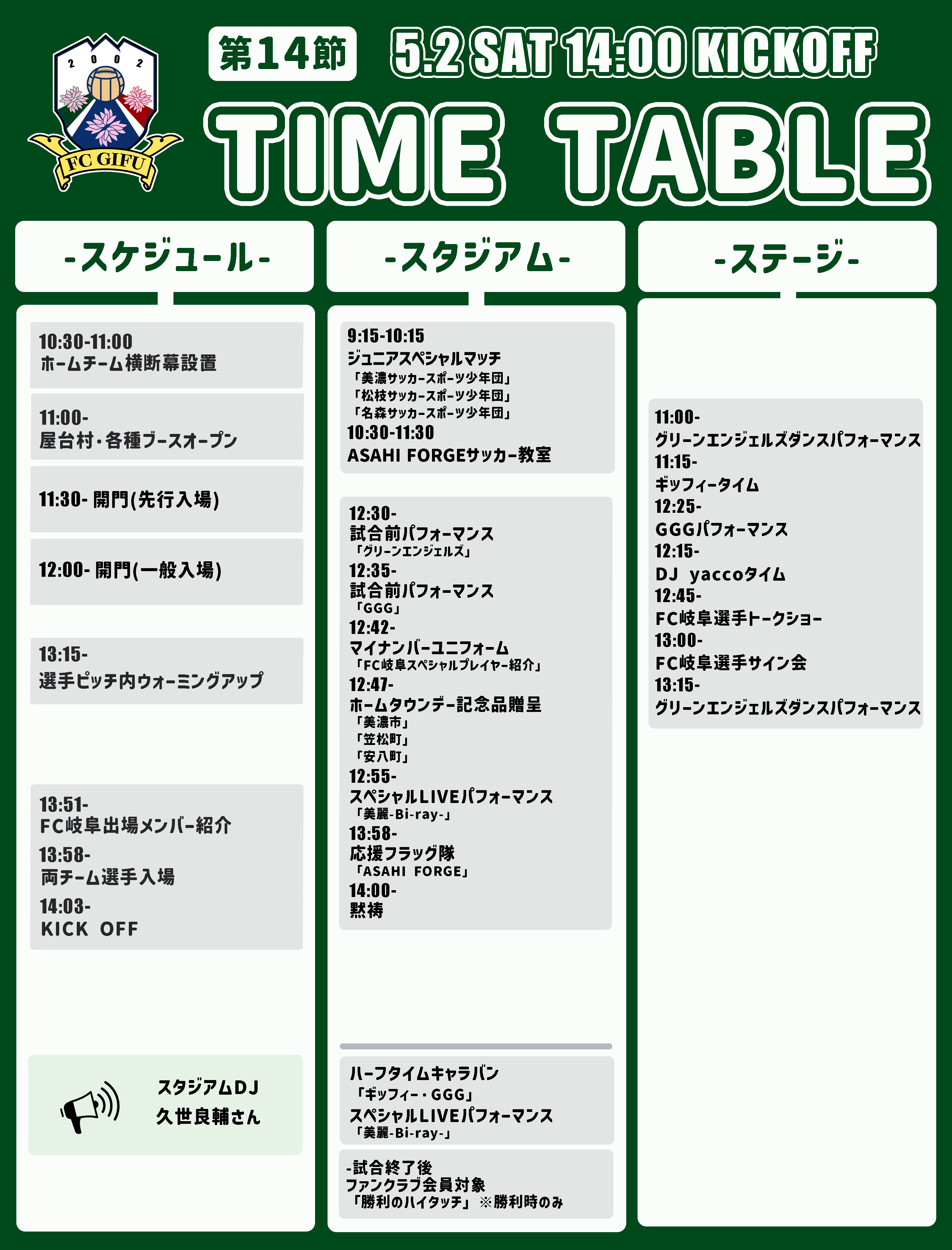 キックオフ前に、FC岐阜の創成期においてクラブ運営の中心を担い、Jリーグ参入に向けた体制構築およびクラブ基盤の確立に尽力されました、故 今西和男氏に哀悼の意を込め、黙祷を捧げます。 多くのビジターサポーターのご来場が見込まれるため、入場ゲートの運用方法を一部変更して開催をいたします。 入場ゲートの運用変更についてビジターゴール裏自由席のチケットをお持ちの方は「ビジター専用ゲート」より入退場、及び再入退場をしていただきます。 詳細は≪こちら≫ 当該試合において、メイン自由席の一部に「関係者席」を設置いたします。 対象エリア内は一般のお客様はご着席いただけません。お知らせ