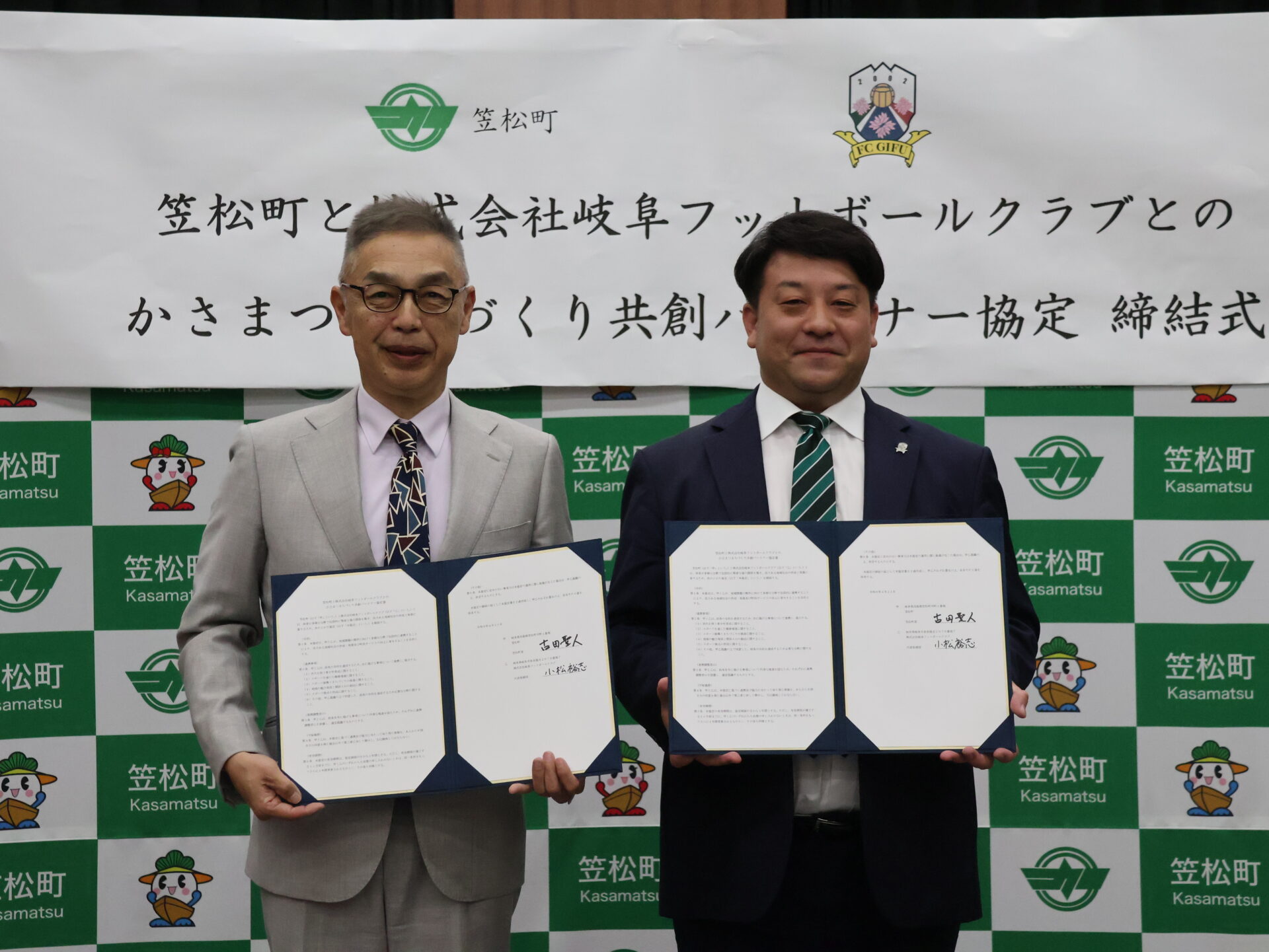 (写真左から笠松町長 古田 聖人 様 、FC岐阜 小松 裕志 社長)