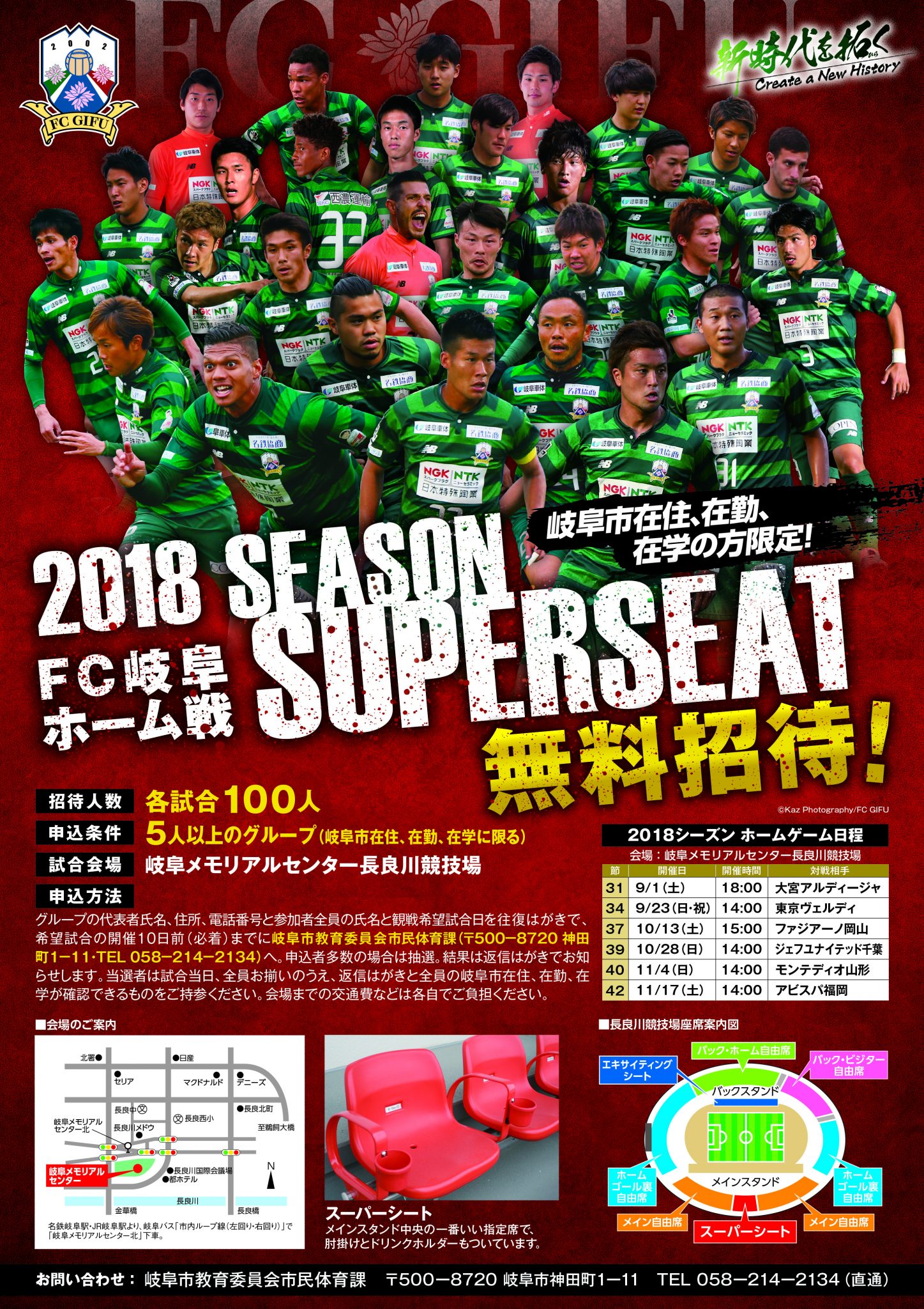 岐阜市在住、在勤、在学の方を対象に2018FC岐阜ホーム戦スーパーシート無料招待を実施しますのでお知らせいたします。なお、本事業は岐阜市のFC岐阜活用事業運営業務委託により実施いたします。