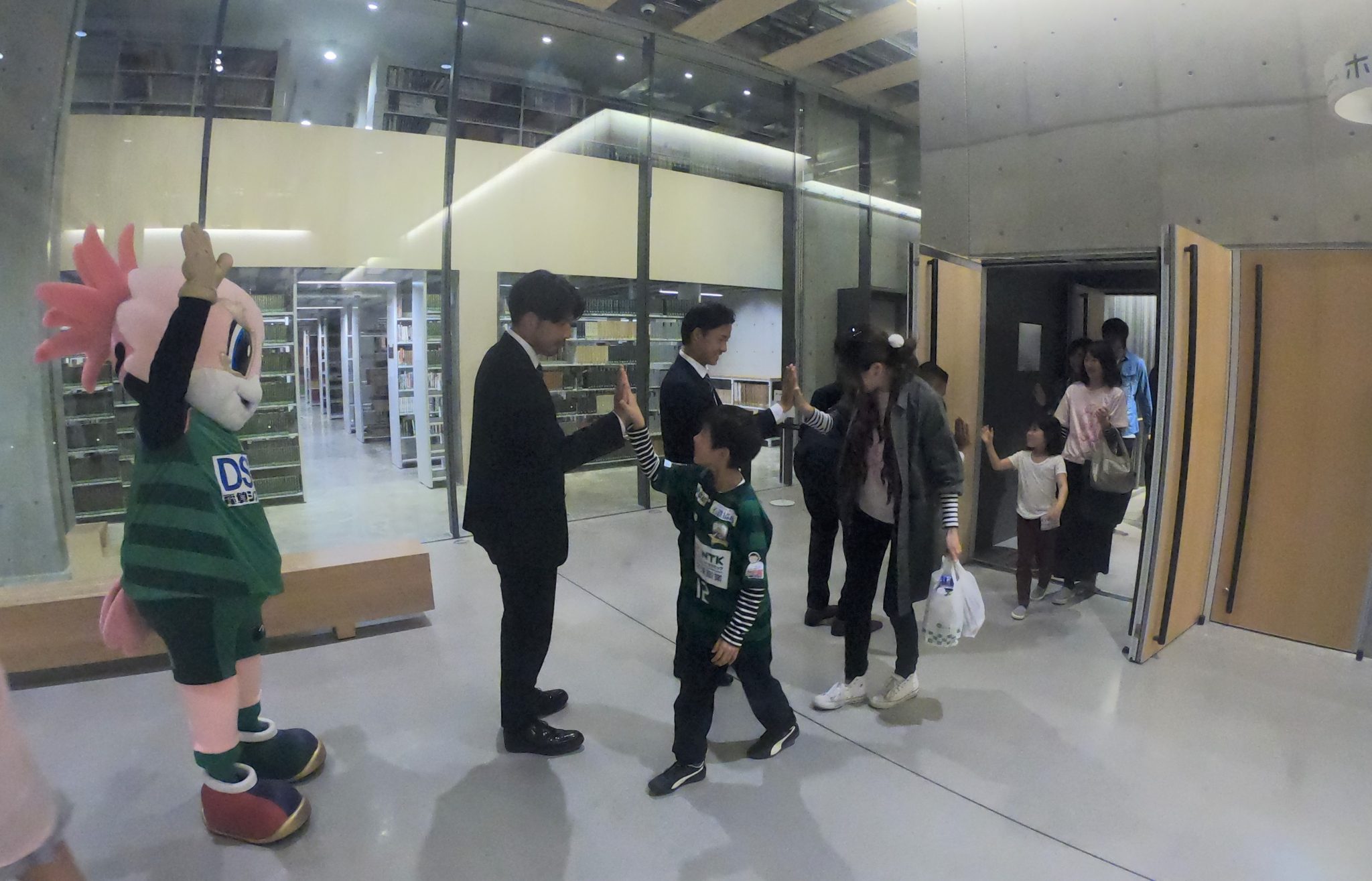 選手とギッフィーがハイタッチでお見送りをいたしました。
