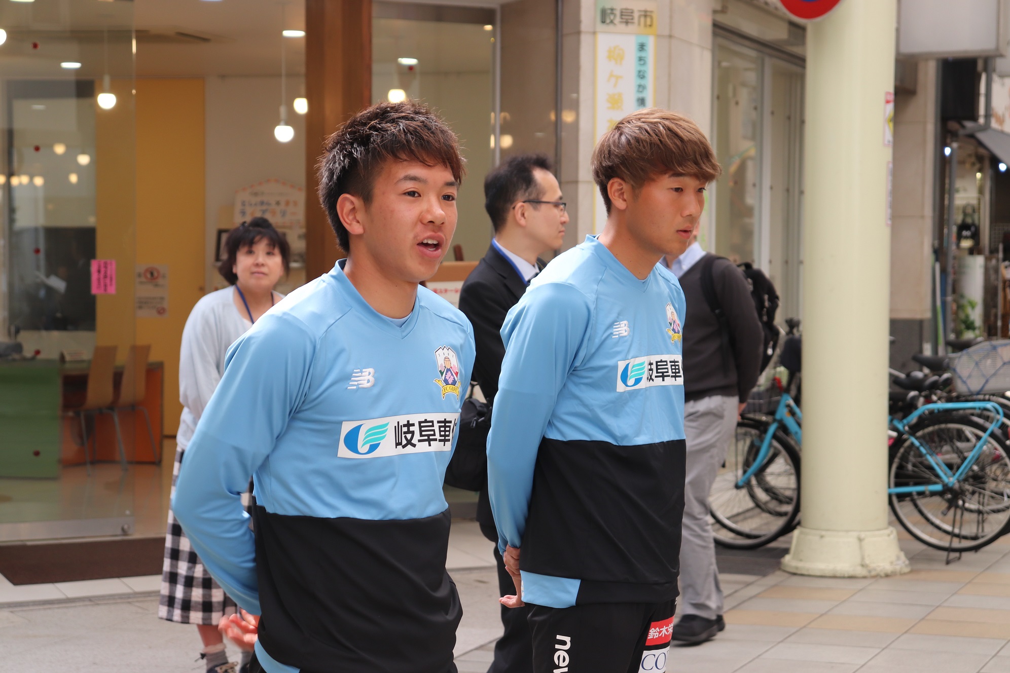 4月2日(月)には、FC岐阜から永島悠史選手、宮本航汰選手が参加してフラッグの掲揚が行われ、岐阜柳ケ瀬商店街振興組合連合会の林亨一理事長よりご挨拶と激励をいただきました。