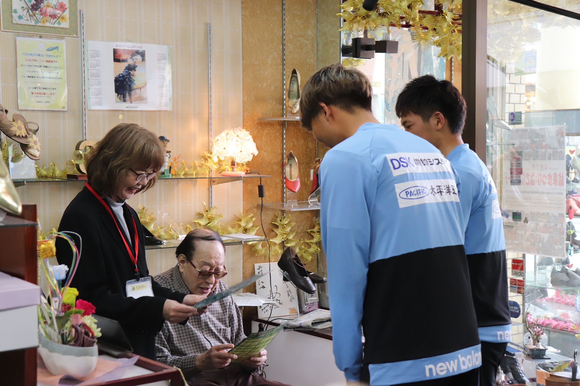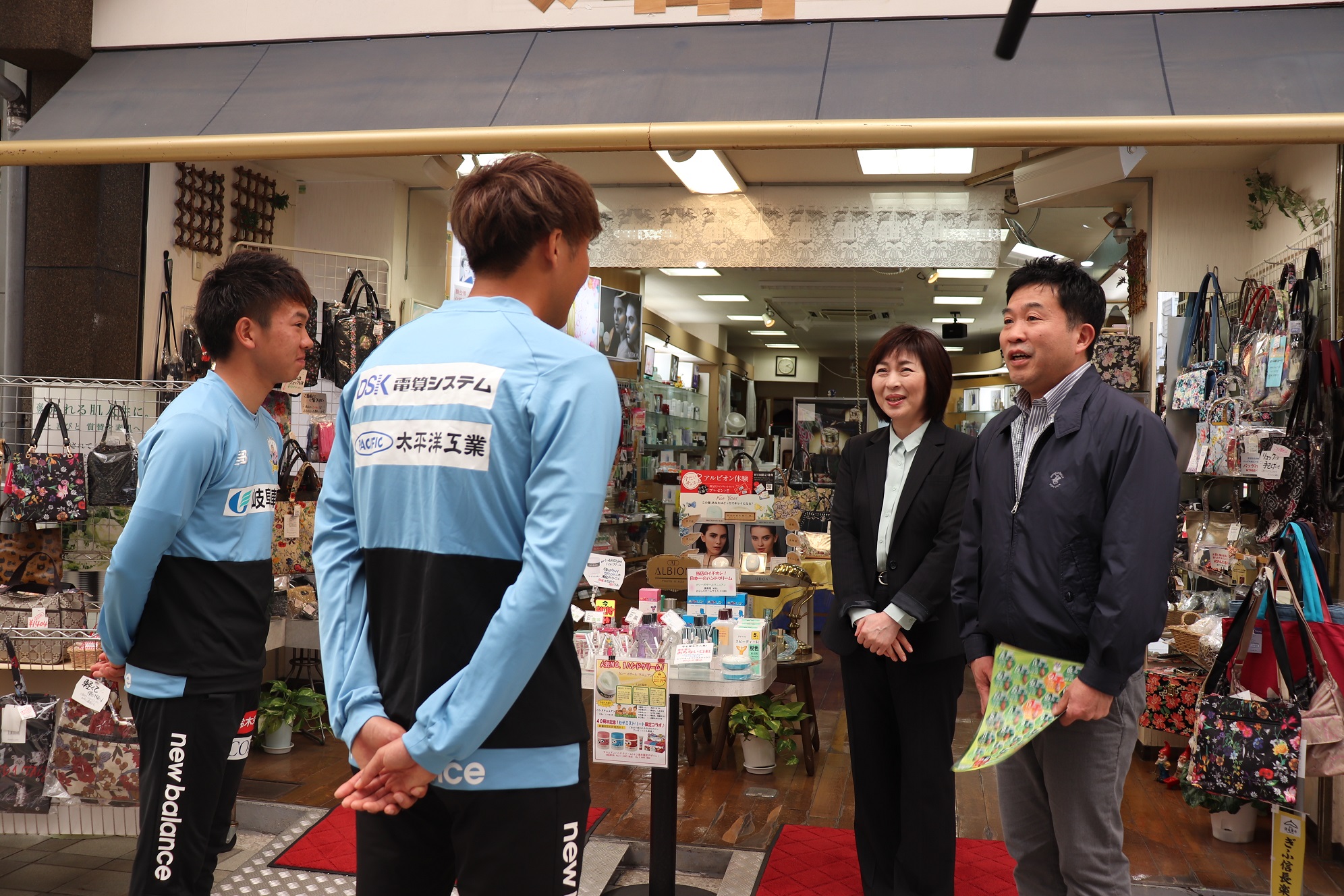 掲揚後には、柳ケ瀬商店街のお店を訪問し、支援への感謝と今後の試合のご案内をさせていただきました。