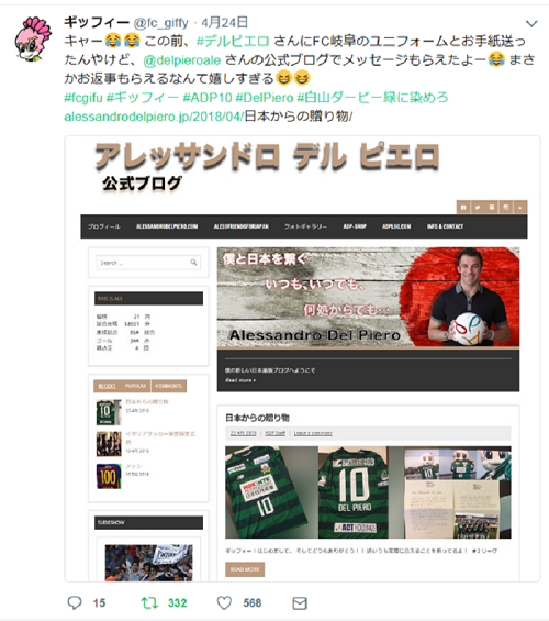 2018オフィシャルユニフォームスポンサーの株式会社野田クレーン様の「キャプテン翼スタジアム垂井」ロゴが入ったユニフォームをFC岐阜公式マスコットキャラクターのギッフィーが、世界的に有名な元イタリア代表のサッカー選手であったデルピエロ氏に贈呈させていただいたところ、ご本人様からSNSを通じてご連絡を頂きました。