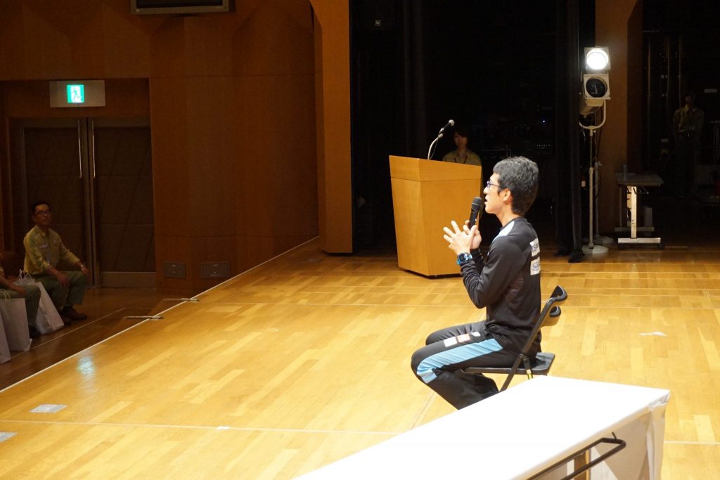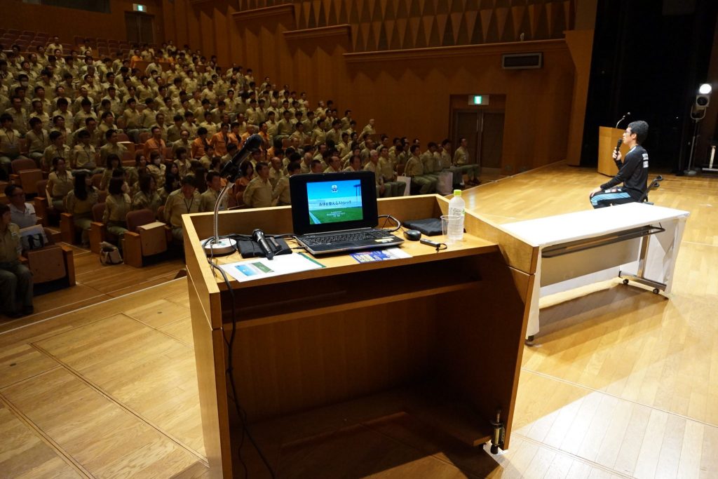 はじめに大野コーチの自己紹介のあとにFC岐阜のチーム状況や地域貢献への取組み等について紹介させていただき、続いて、その場で座ったままでもできるストレッチを織り交ぜながら講話を進めさせていただきました。