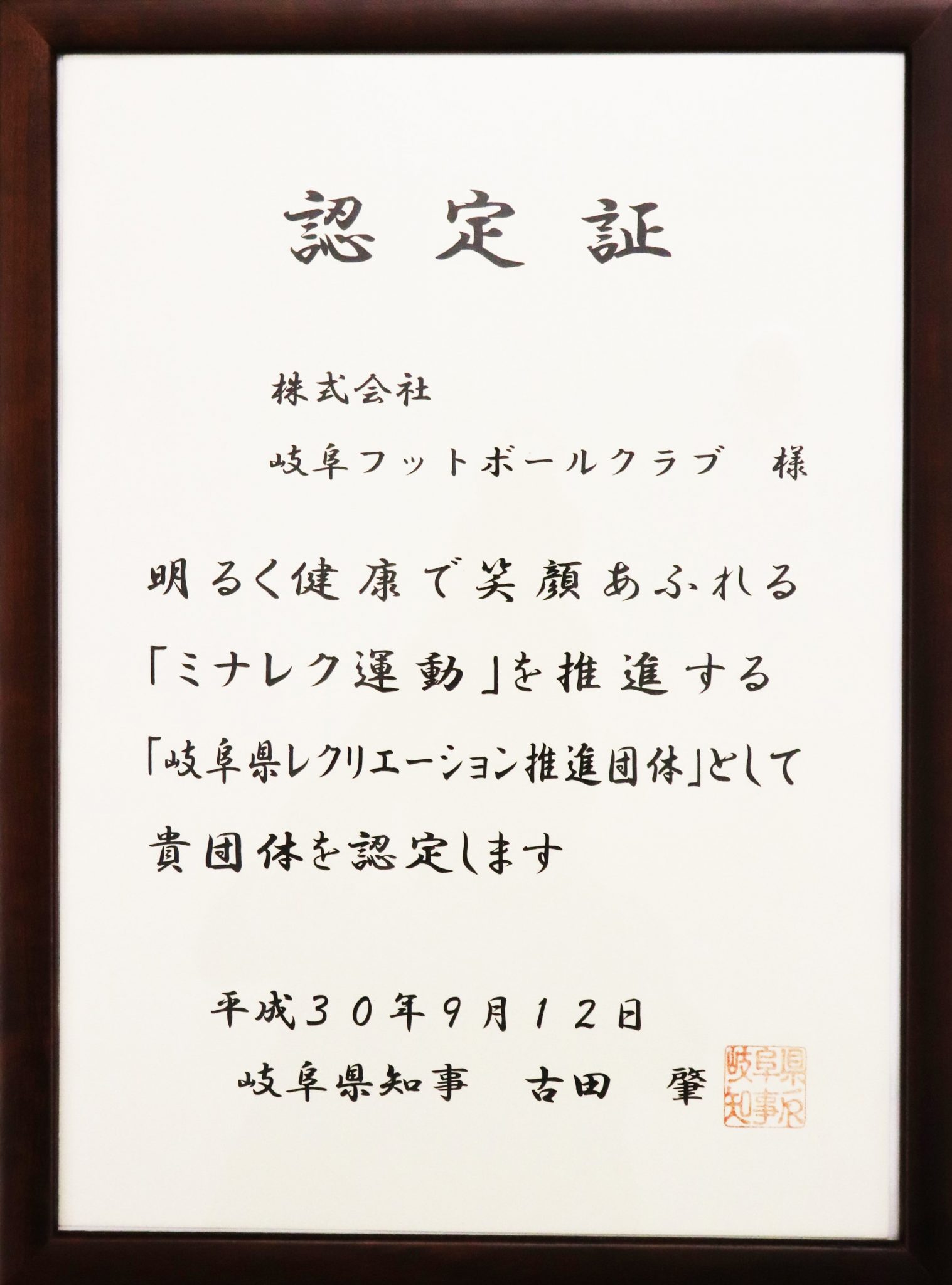 FC岐阜が「岐阜県レクリエーション推進団体」に認定されました