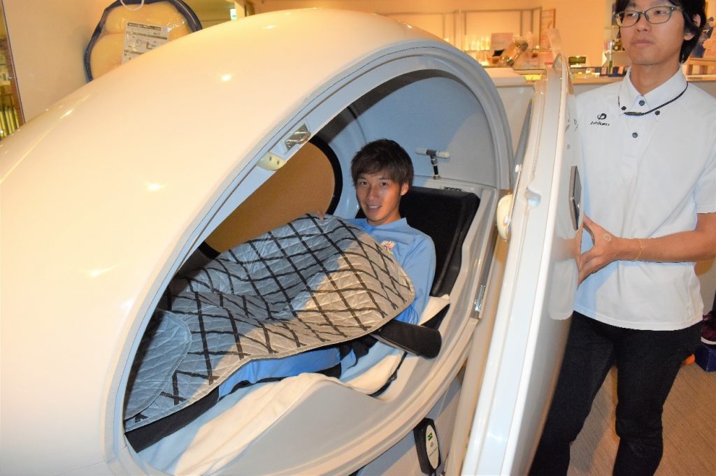 見慣れないカプセルに山岸選手も興味深々。