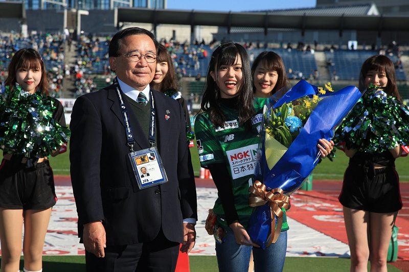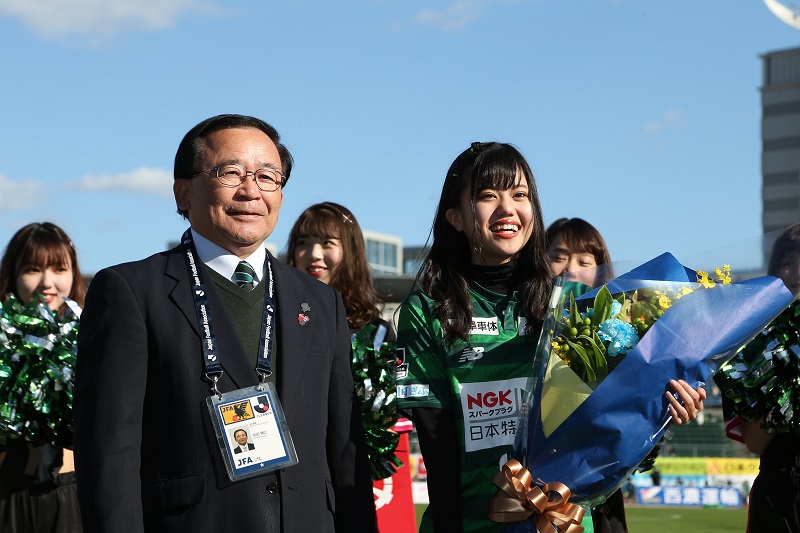 SKE48からの卒業を発表したFC岐阜アンバサダーの町音葉さんに、卒業の花束を贈呈いたしました。