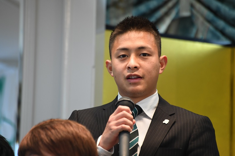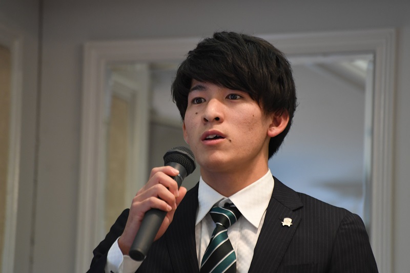 「大阪府の近畿大学から加入することになりました粟飯原尚平です。岐阜のみなさんに熱いプレーを届けられるようにがんばりますので、よろしくお願いします。」