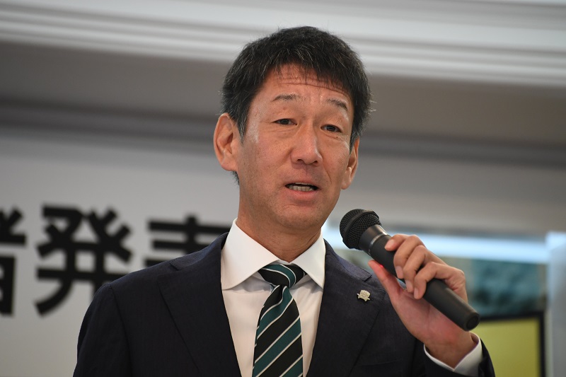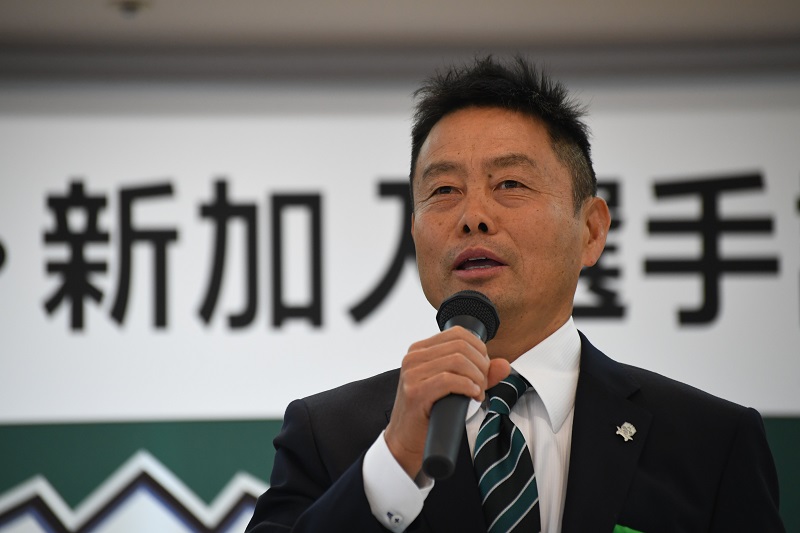 新体制・新加入選手記者発表では、宮田博之社長、大木武監督、新加入コーチ2名、新加入選手11名が登壇しました。