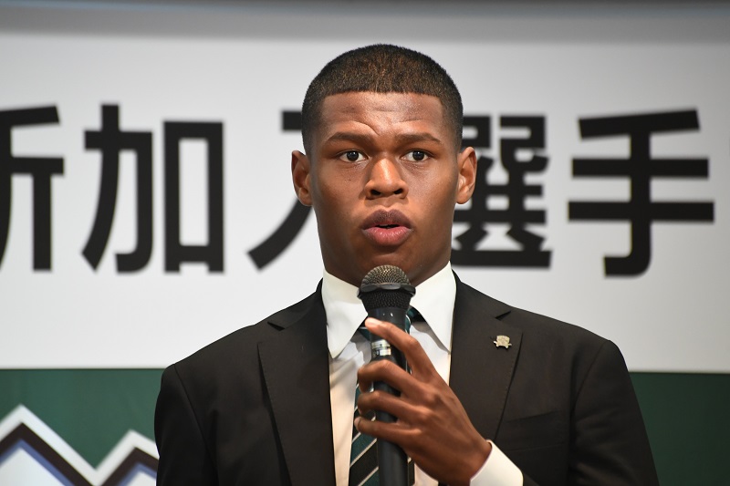 「川崎フロンターレから加入することになりましたタビナス ジェファーソンです。一試合でも多くの試合に出場して勝利に貢献できるようにがんばります。」