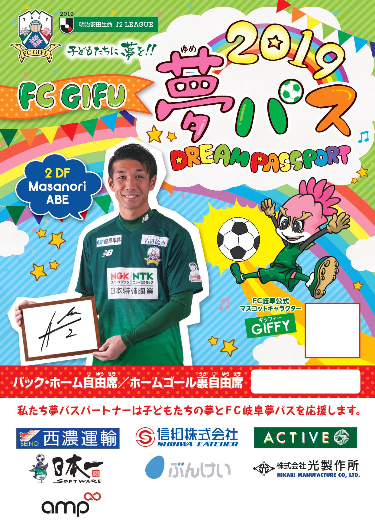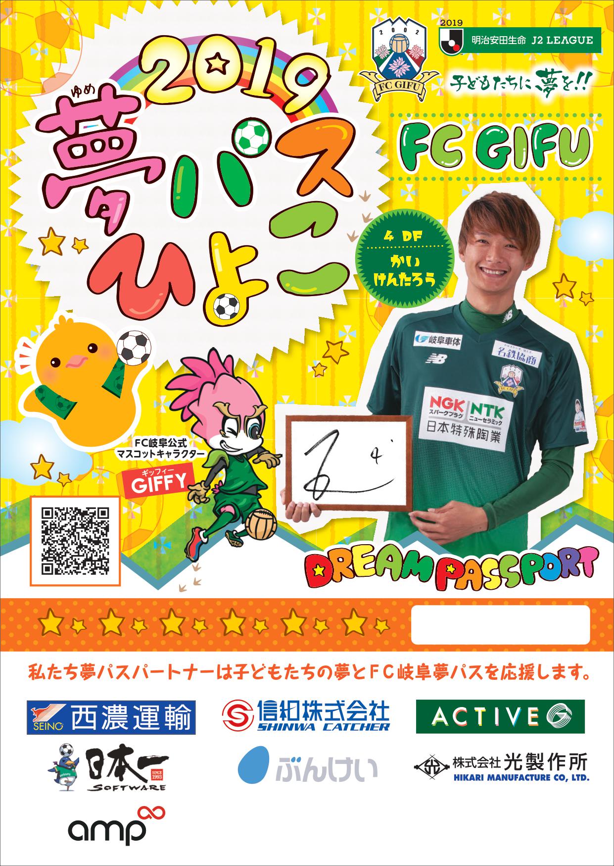 FC岐阜のクラブ理念「子どもたちに夢を!!」にご賛同いただいた夢パスパートナー企業様のご協力により、岐阜県内の小学生の皆さんが2019明治安田生命J2リーグ戦<FC岐阜ホームゲーム>を全試合無料で観戦できる「夢のパスポート」です。