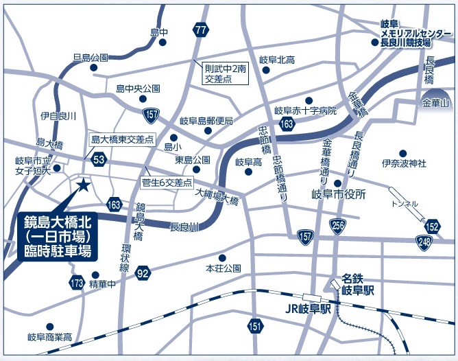 ※試合会場となります岐阜メモリアルセンター周辺は大変混雑し、周辺駐車場が満車となることが予想されます。公共交通機関や鏡島大橋北(一日市場)臨時駐車場のご利用をお願いいたします。