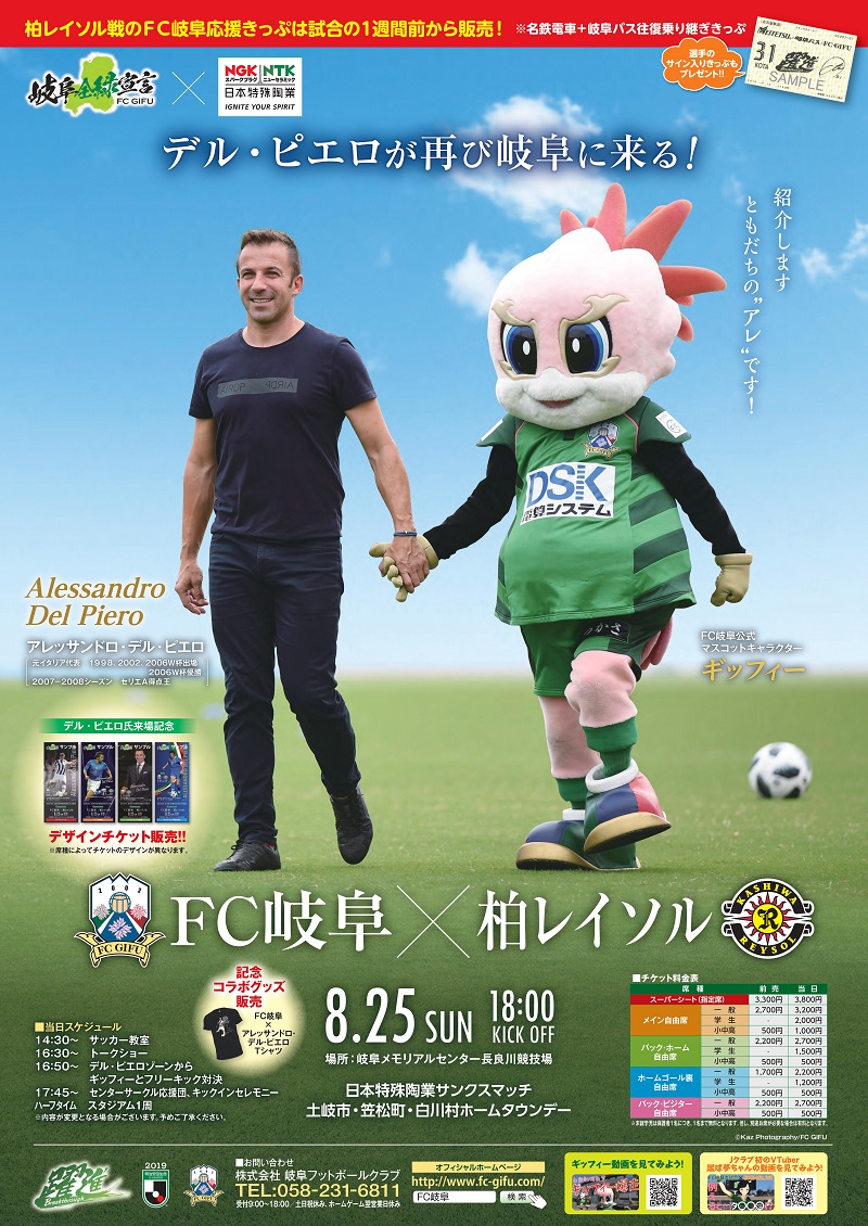 『炎熱の大逆襲ポスター』および、デル・ピエロ氏が来場する8月25日(日)柏レイソル戦に向けて新しいポスターが完成いたしましたのでお知らせいたします。当日は多くの方にスタジアムへご来場いただきたく、ぜひ、ファン・サポーターの皆様にはポスター掲示のご協力をお願い申し上げます。ポスターは、FC岐阜事務所にて掲示先をご記入いただき、お渡し致します。