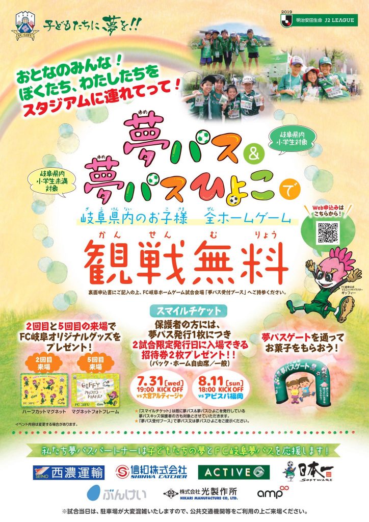 7/31(水)大宮アルディージャ戦、8/11(日・祝)アビスパ福岡戦、夏休み!家族みんなでFC岐阜を応援しよう!夢パス/夢パスひよこ保護者様をご招待!