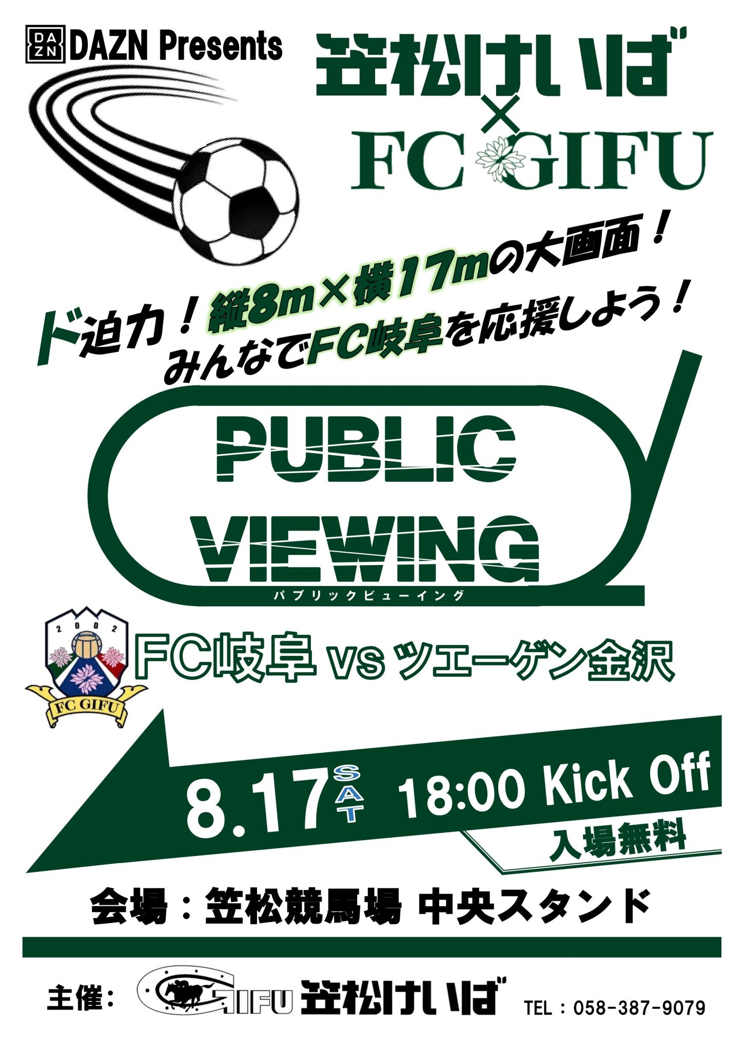 8月17日(土)「笠松競馬場」にて、アウェイ ツエーゲン金沢戦(白山ダービー ~石川西部の陣~)のパブリックビューイングを開催いたします。