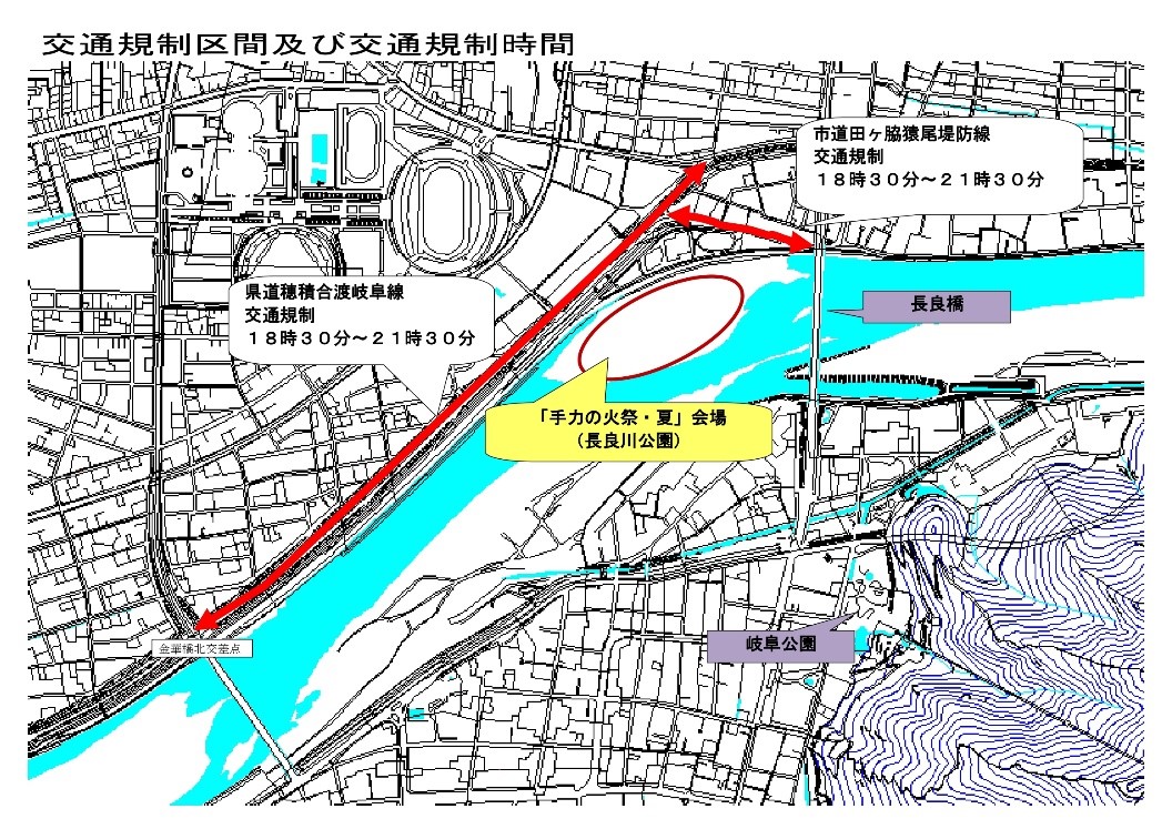 8月11(日・祝)に岐阜メモリアルセンター長良川競技場にて開催する「明治安田生命J2リーグ第27節FC岐阜vsアビスパ福岡」では、スタジアム近隣にて「手力の火祭・夏」と「鷺山夏祭り大会」の2つの祭が開催される関係上、周辺道路にて交通規制が行われます。