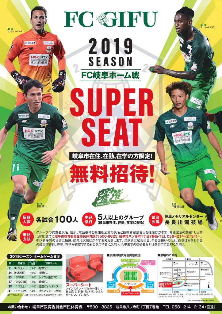 岐阜市在住、在勤、在学の方を対象に2019FC岐阜ホーム戦スーパーシート無料招待を実施しますのでお知らせいたします。なお、本事業は岐阜市のFC岐阜活用事業運営業務委託により実施いたします。