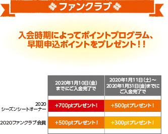 2019年12月7日(土)~2020年1月10日(金)までにお申込み・ご入金完了いただいた方全員 … 早期申込ポイント700pt(シーズンシートオーナー)又は500pt(ファンクラブ会員)プレゼント!