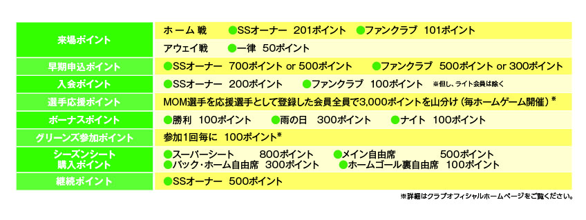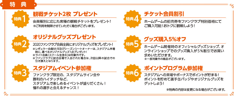2020シーズンシートオーナーは2020ファンクラブに自動入会となり、ファンクラブ特典の対象となります。ポイントプログラムではファンクラブ会員よりお得にポイントが貯まります!ファンクラブ特典の詳細はファンクラブ案内をご覧ください。