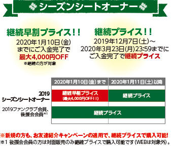 ※1 2019シーズンシートオーナー、ファンクラブ会員、後援会会員の方で、2020シーズンシートご購入の方を対象とします。