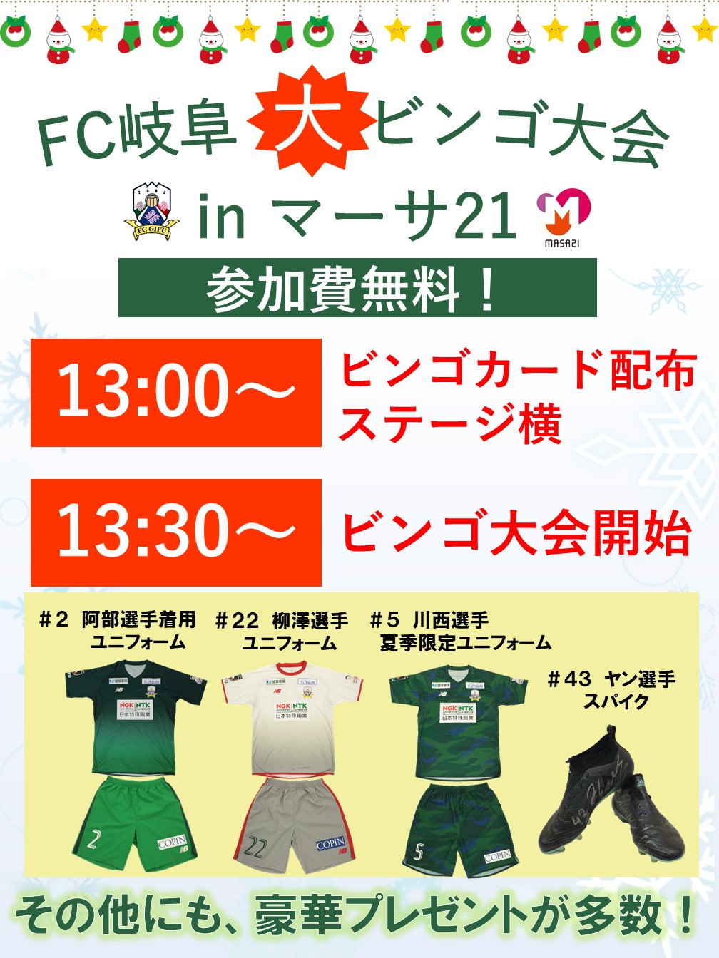 子どもたちに大人気のシュートスピード測定やFC岐阜グッズなどが当たるビンゴ大会、選手私物のチャリティオークションなどイベントが盛りだくさん!12月21日(土)は、ぜひマーサ21ショッピングセンターへお越しください!