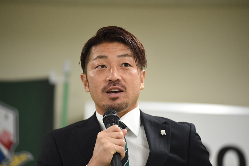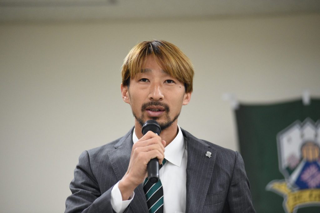 「松本山雅から来ました高崎寛之です。J2に昇格することを目標に自分はFWなので得点をたくさん取ってチームに貢献できるように頑張っていきたいと思います。応援よろしくお願いします。」