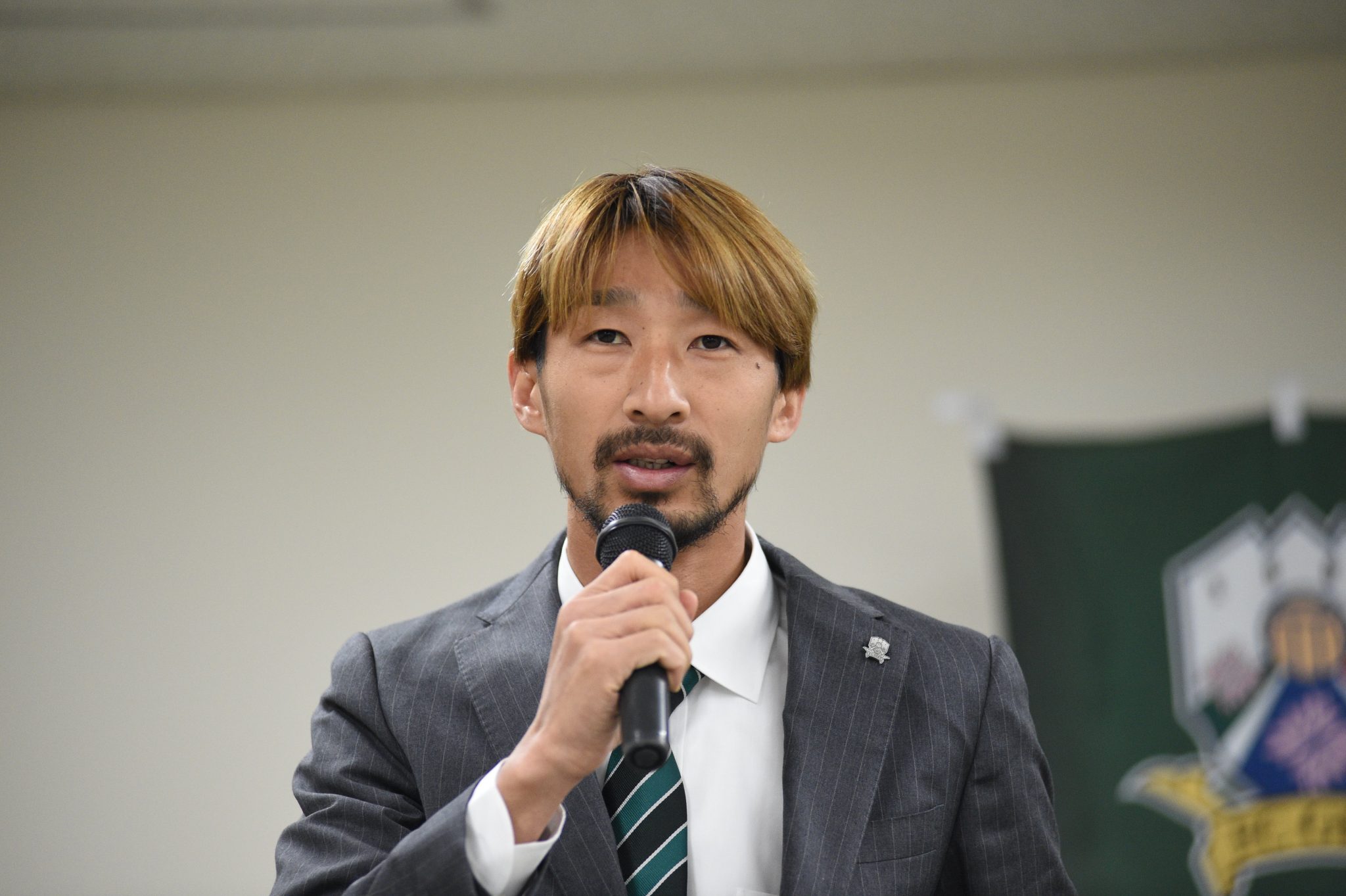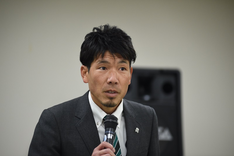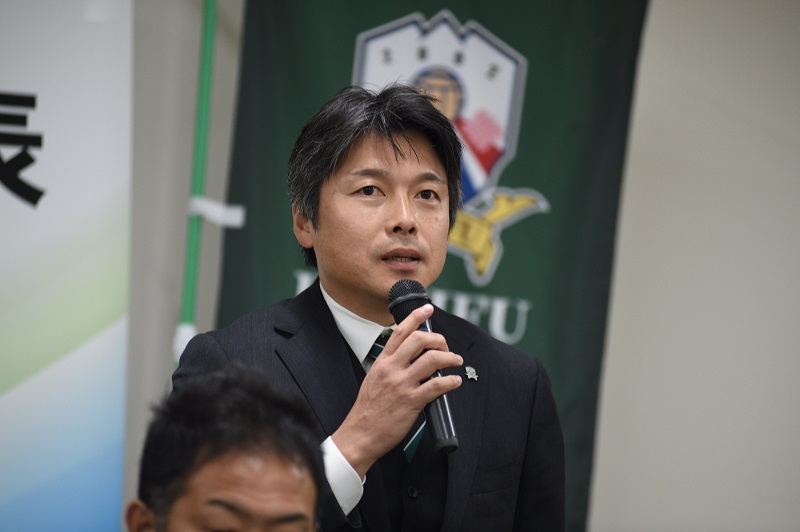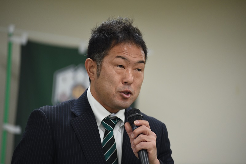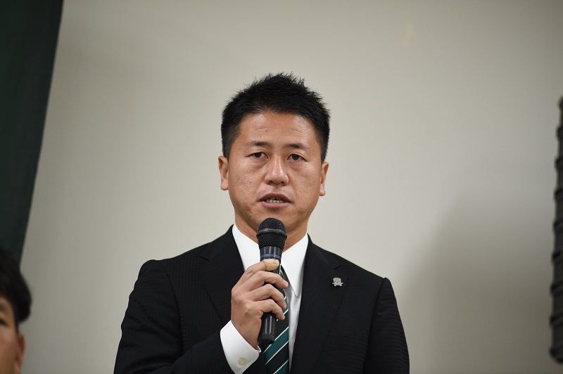 「こんにちは。GKコーチの太田渉です。昨年まではブラウブリッツ秋田、同じJ3のチームでGKコーチをしていました。FC岐阜にかかわる岐阜の全ての皆さんのひとつの挨拶であったり、人への気遣い、選手であればパス一本、シュート一本、セーブひとつ、そういうひとつひとつがFC岐阜の垢、汚れたものをきれいにするきっかけになると思うので、今日のひとつひとつの行動、言動、そしてひとつひとつの練習がJ2に進むために必要なことだと思っているので、みなさんと一丸で一緒になって前に進んでいきたいと思っています。一年間よろしくお願いします。」