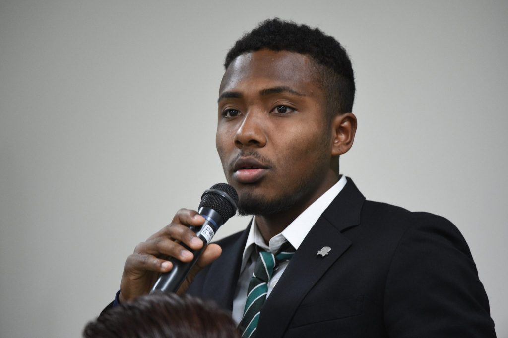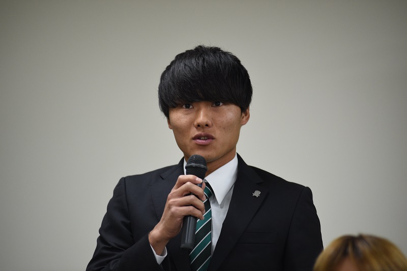 「こんにちは。JAPANサッカーカレッジから来ました町田ブライトです。プロは初めてですが、睡眠や食事をしっかりとって先輩たちから色々学び、点を取れるストライカーになります。よろしくお願いします」