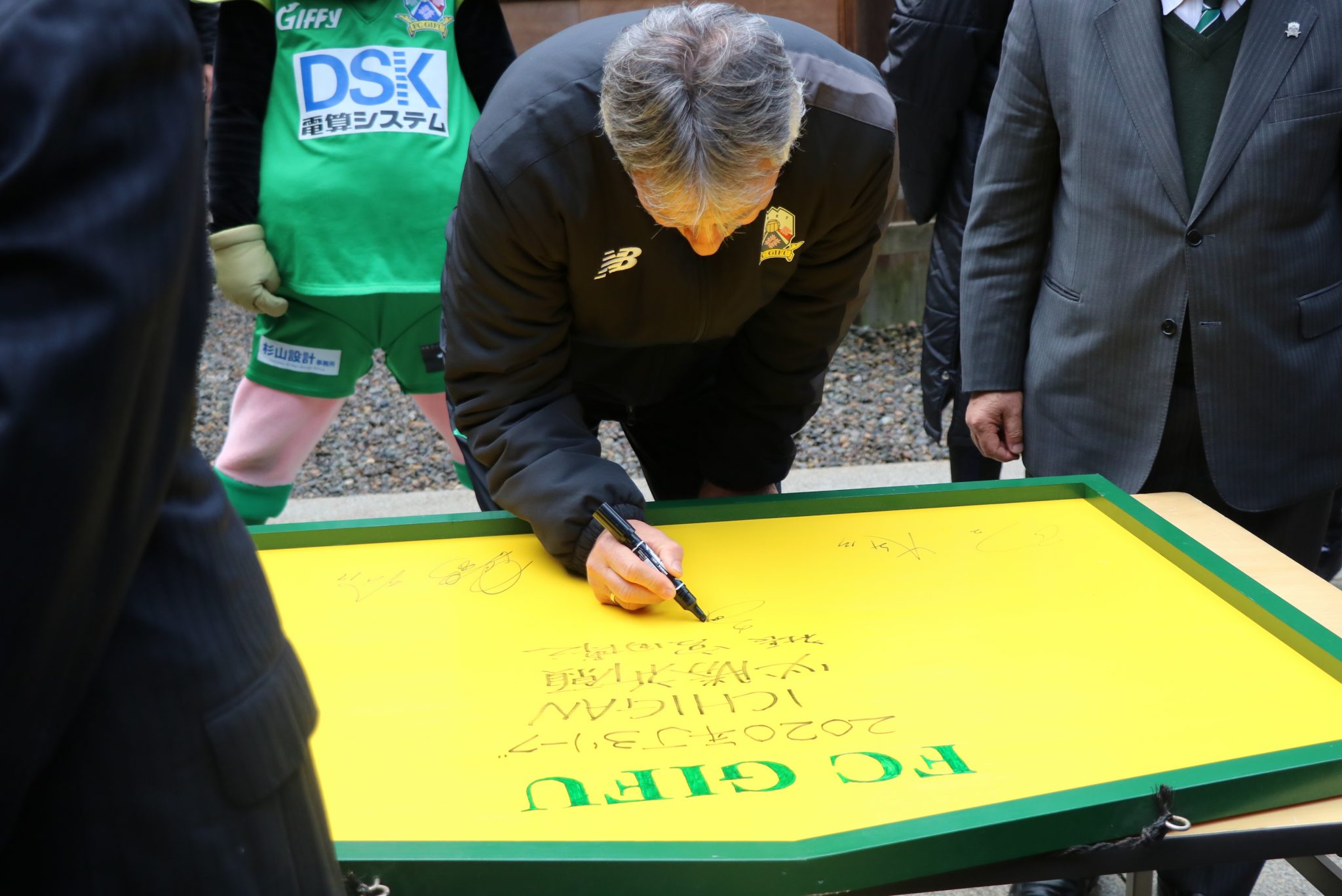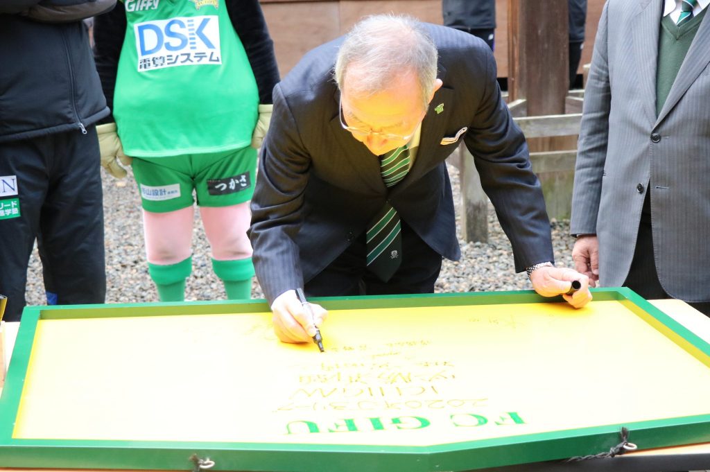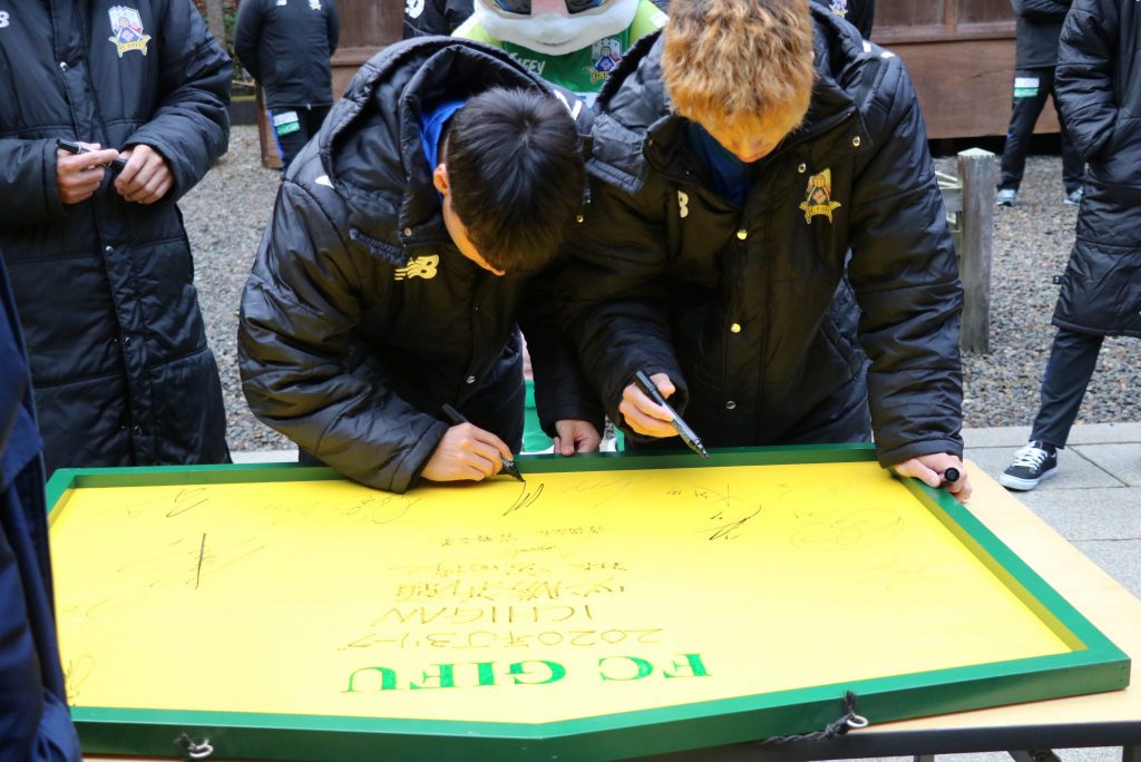 厳粛な神事に続いて、絵馬に2020シーズンの必勝の願いを込めて、まずは宮田社長が2020シーズンのチームスローガンである「ICHIGAN」の文字と名前を書き込みました。