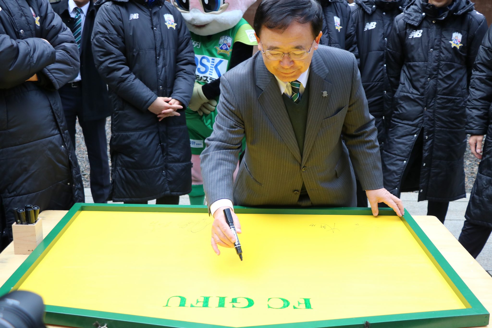 その後、ゼムノビッチ監督、岸野会長、選手、チームスタッフがサインを書き込みました。