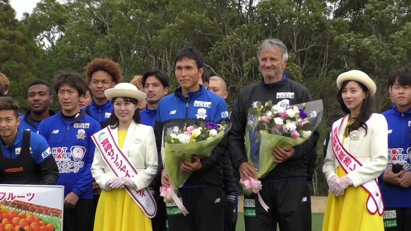 歓迎セレモニーでは、まず初めにゼムノビッチ監督、前田遼一選手の両名に花束が贈呈されました。続いて宮崎市スポーツランド推進課課長 松田 智之様より地元の特産品(完熟キンカン、イチゴ、日向夏)を贈呈いただき、歓迎挨拶をいただきました。