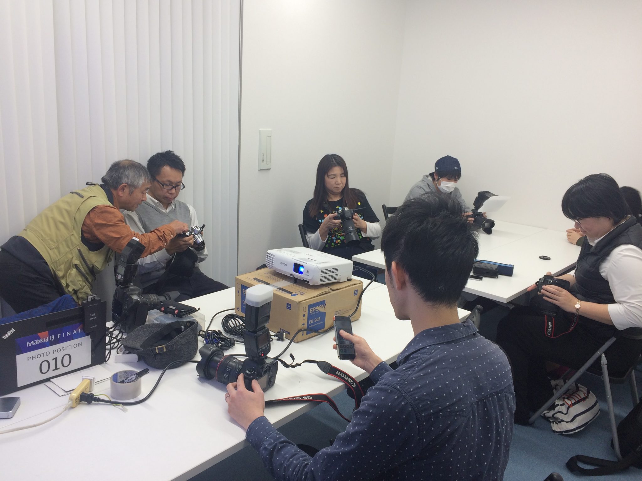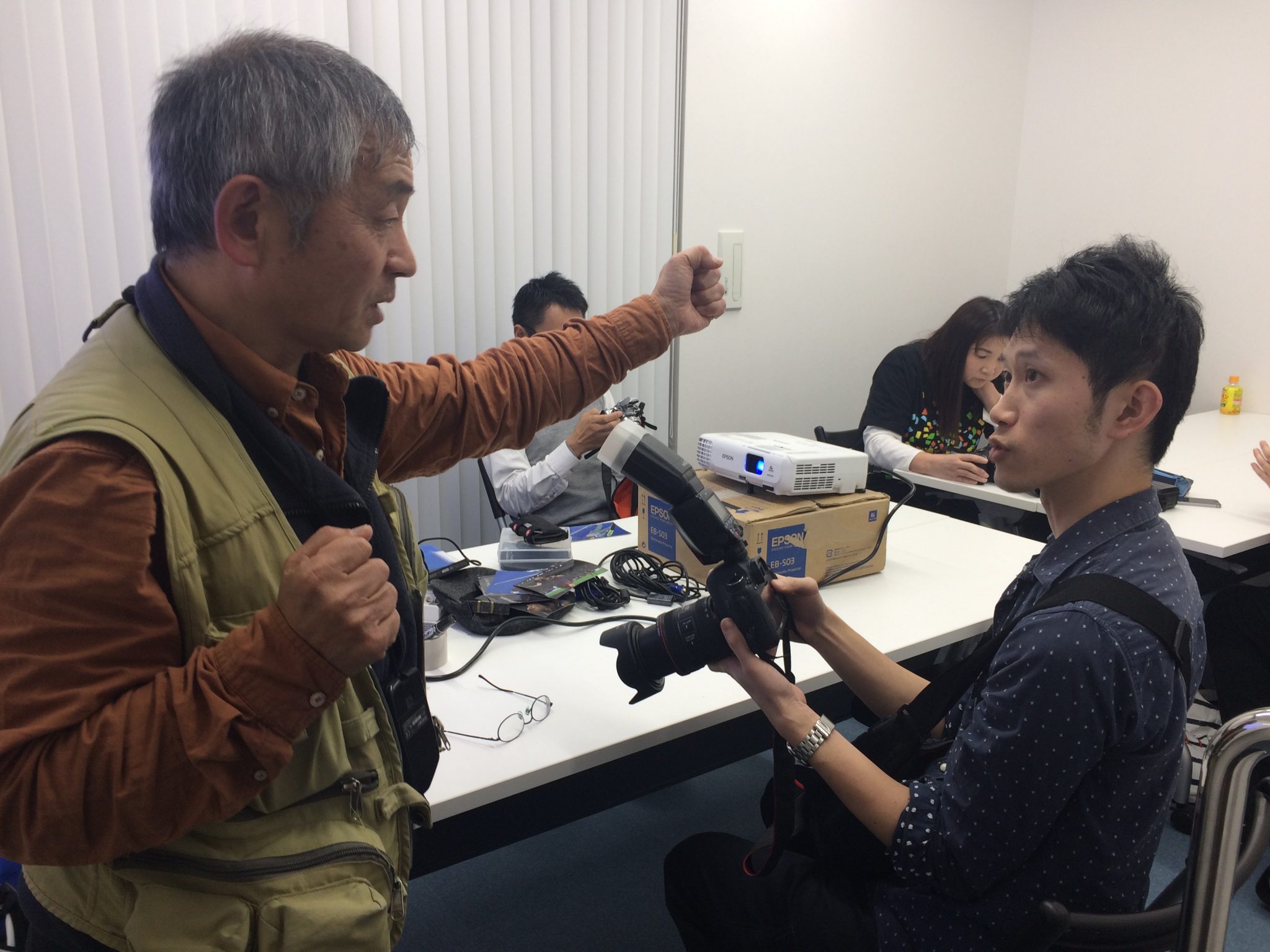 まず最初に、自己紹介を終えると全員でポートレートの撮影を行い、現在の技術を確認。スタッフを題材に、参加者の皆さんが思い思いに撮影し、それを山田さんが一人一人、アドバイスしていきました。