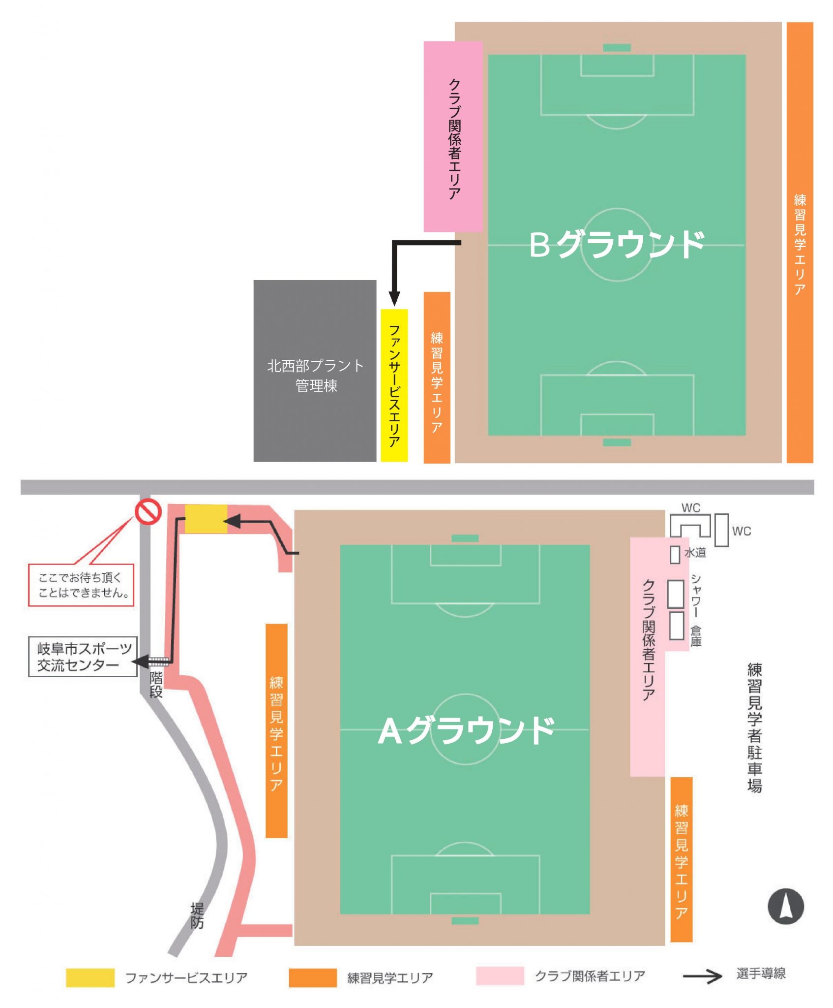 北西部運動公園のBグラウンド完成に伴いまして、FC岐阜トップチームがBグラウンドを使用する際の練習見学エリア及びファンサービスエリアについてお知らせいたします。