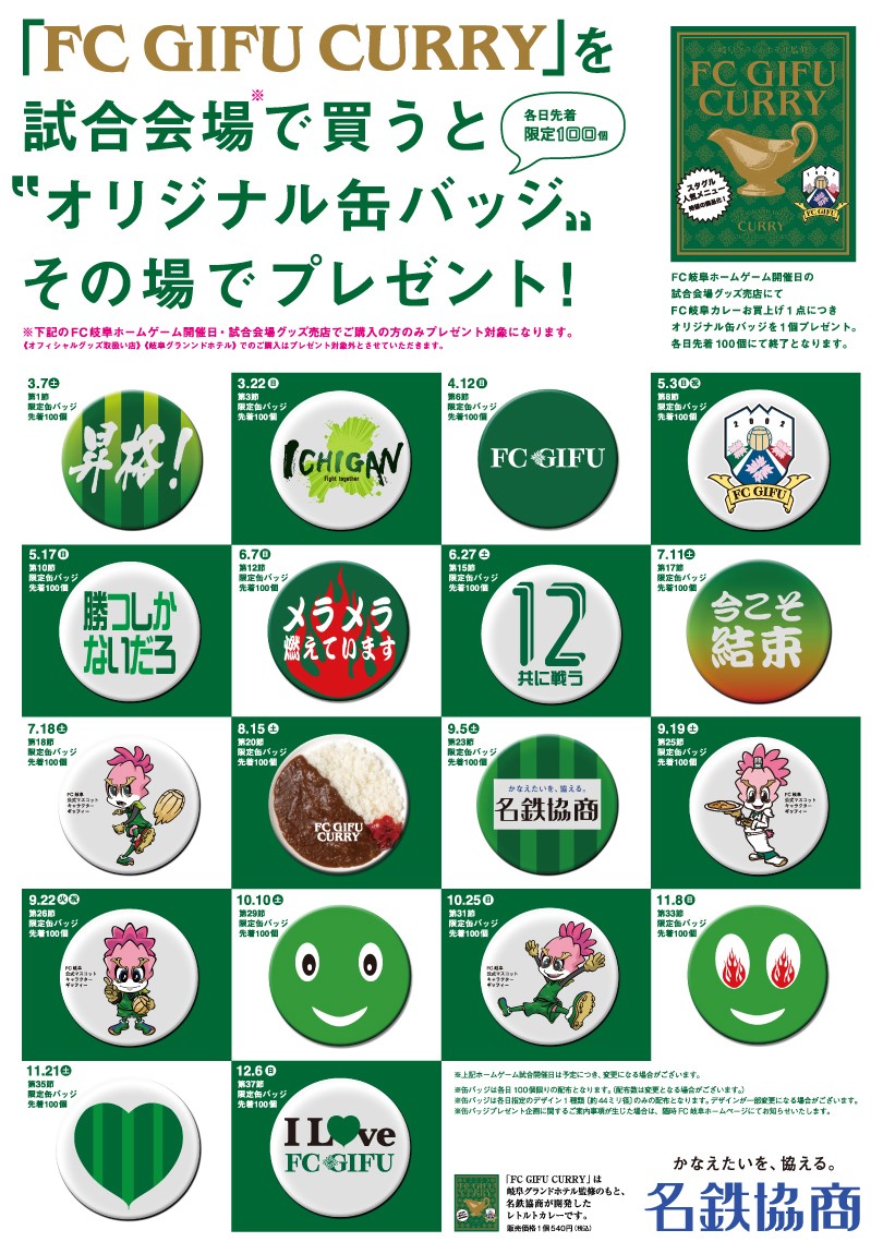 FC岐阜のホームゲーム開催時にオフィシャルグッズショップで岐阜グランドホテル監修「FC GIFU CURRY」を購入していただいた方にその場でオリジナル缶バッジをプレゼント!