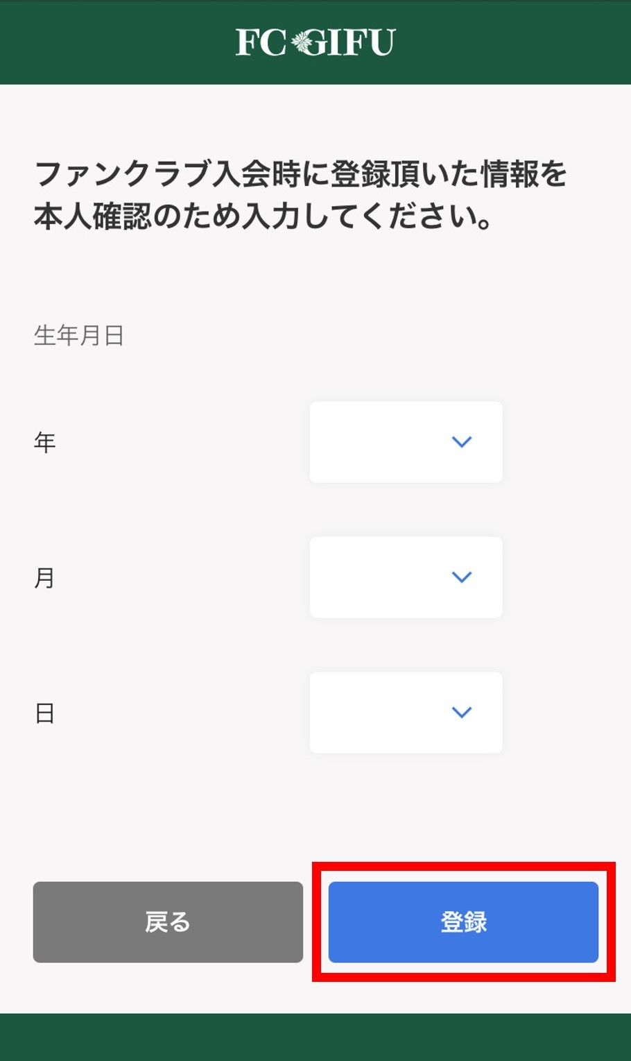 ⑤本人確認のため、申込み時に記載した生年月日を入力いただき「登録」をクリック